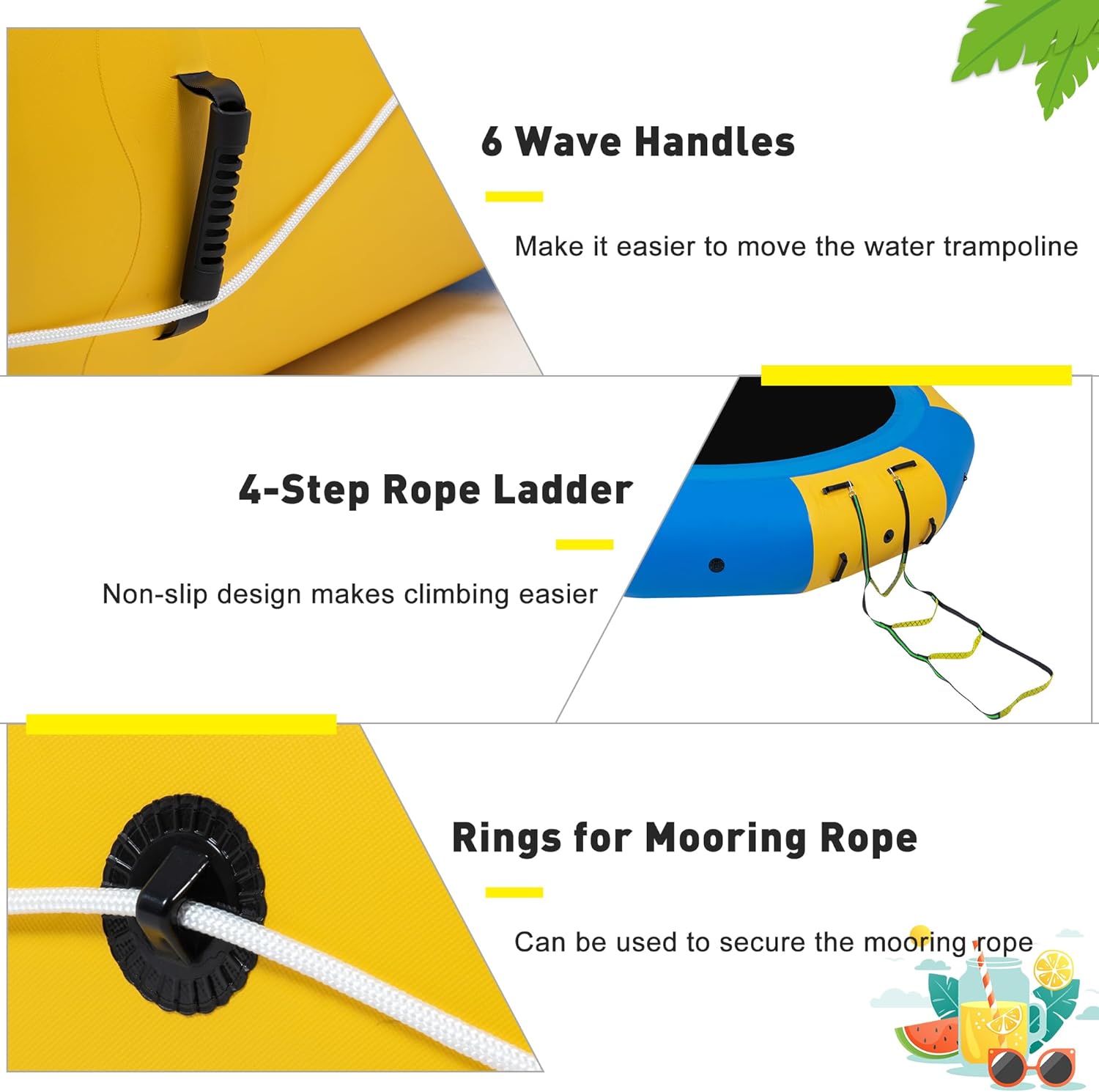 What’s Included: Inflatable water trampoline, electric air pump, 4-step rope ladder, 2 mooring ropes, repair kit, storage bag, and user manual.