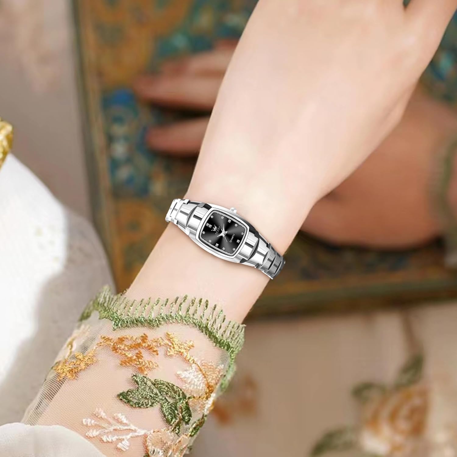 The womens silver watch dial is inlaid with bling diamonds, in the sunlight, it is very bright from all angles. The small face women watch with the luxury tungsten steel and the unique rectangle design making you outstanding.