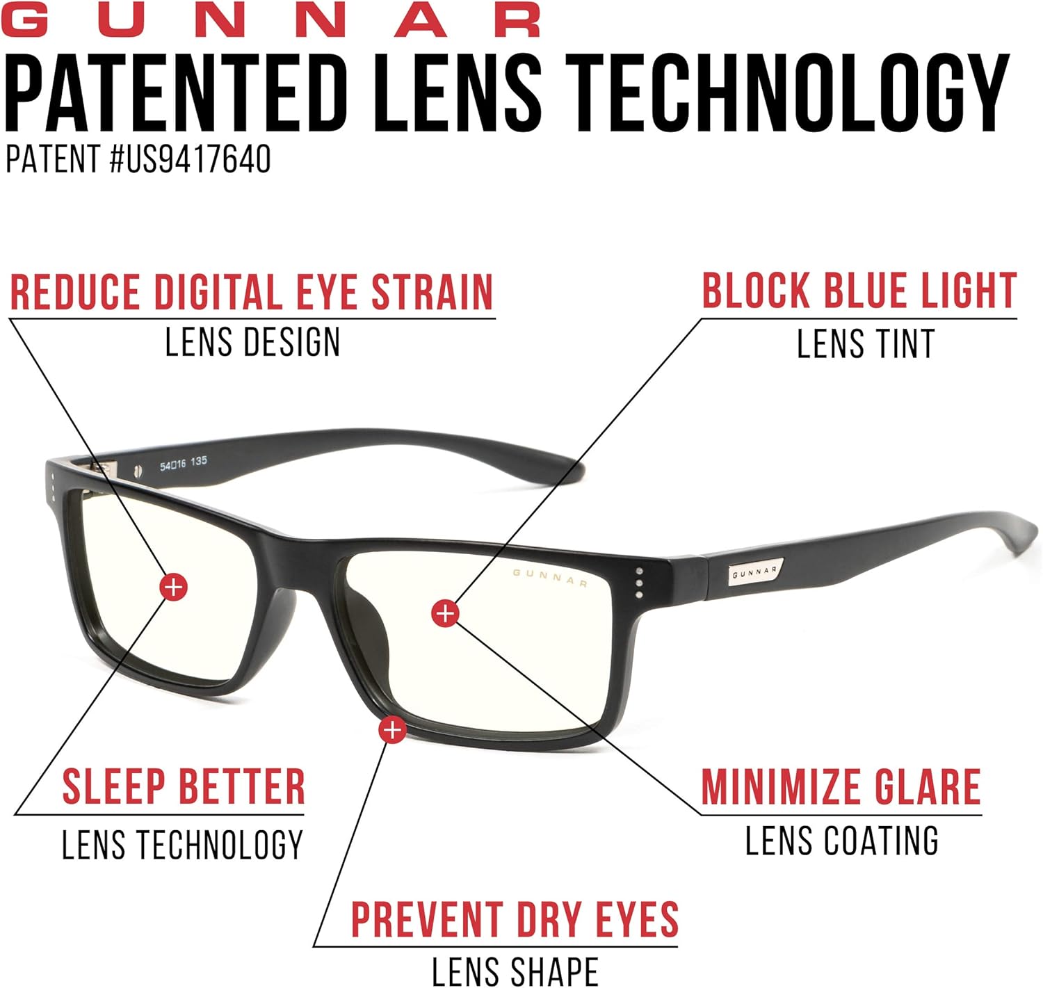 GUNNAR produces the only blue light blocking computer and gaming glasses with Patented Lens (#9417460) Technology that is recommended by doctors to protect and enhance your vision. GUNNAR improves performance while viewing tablets, smartphones, TV & computers to reduce digital eye strain, fatigue and headaches. Unlike other blue light blocking glasses, GUNNAR developed the Blue Light Protection Factor™, telling you exactly how much of the peak blue light spectrum (450nm) we’re blocking. Not all blue light glasses in the market protects you from the strongest high-energy visible light. The preferred gaming glass for men and women, GUNNAR protects against symptoms stemming from prolonged screen-staring including migraines, headaches, dry eyes, blurry vision, negative effects of blue light exposure, cataracts and macular degeneration SPECS (in mm) Lens Width: 55, Bridge: 16, Temple: 133, Weight: 21gm, Fit: Small. GUNNAR produces ergonomically designed gaming/computer eyewear with a lightweight frame to give you a full day of comfortable screen viewing. INCLUDED with your purchase of our gaming and computer glasses – microfiber pouch, microfiber cleaning cloth, 30-day return policy & one-year warranty. GUNNAR gaming glasses enhance performance and provide a competitive edge. Play better with styles designed for panoramic viewing and audio headset compatibility.