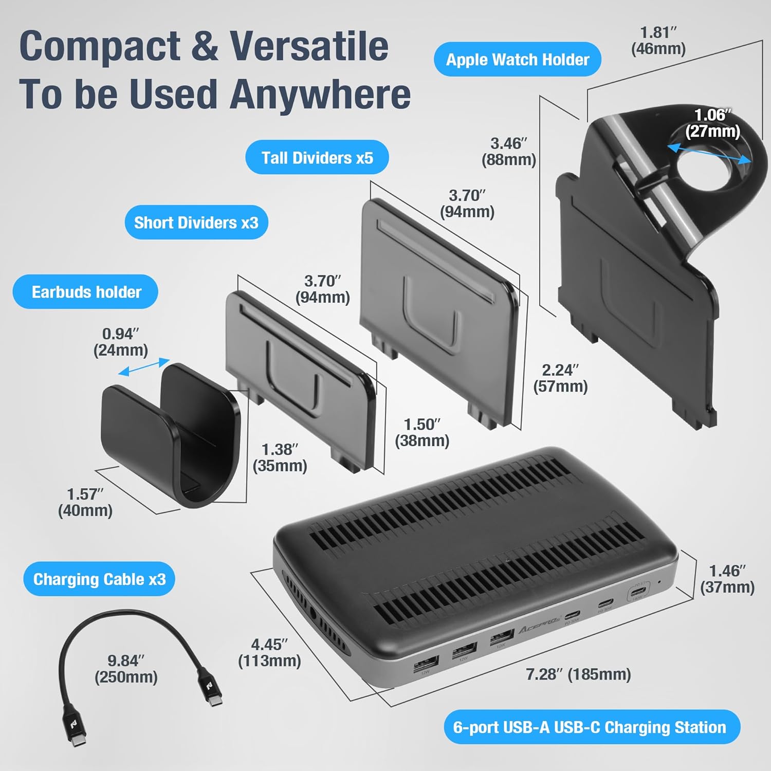 160W 6-Port USB-C USB-A Charging Station Organizer with PD3.1 140W for Multiple Devices Compatible with MacBook iPhone iPad AirPods Smartphone Gaming Handheld Tablet Includes Charging Cables