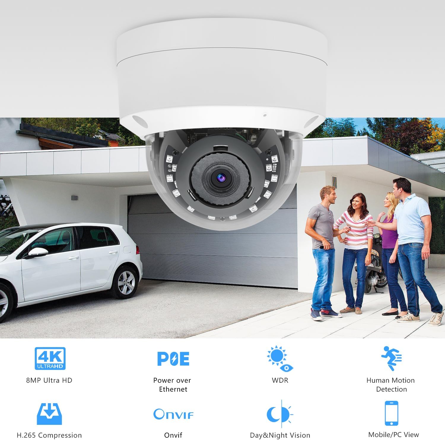 【4K 8MP ULTRA HD+POE+2.8MM LENS】This PoE ip dome camera has equipped with 8Megapixel (3840×2160) Ultra high definition and 2.8mm lens, which can provides you a more clear image than 5mp/6mp/full HD 1080p cameras. With PoE (Power over Ethernet) function, you can use a single Ethernet cable to transmit both data and power, and no need power adapter( PoE switch/PoE Injector required, not included).