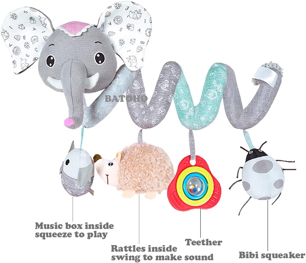 Baby Car Seat Toys, Hanging Stroller Toys for Baby 0-6 Months Infants Activity Spiral Toys with Musical Owl Rattles Hedgehog Beep Ladybug Squeaker – Gray Elephant Toys for Newborn Baby 0 3 6 12 Months