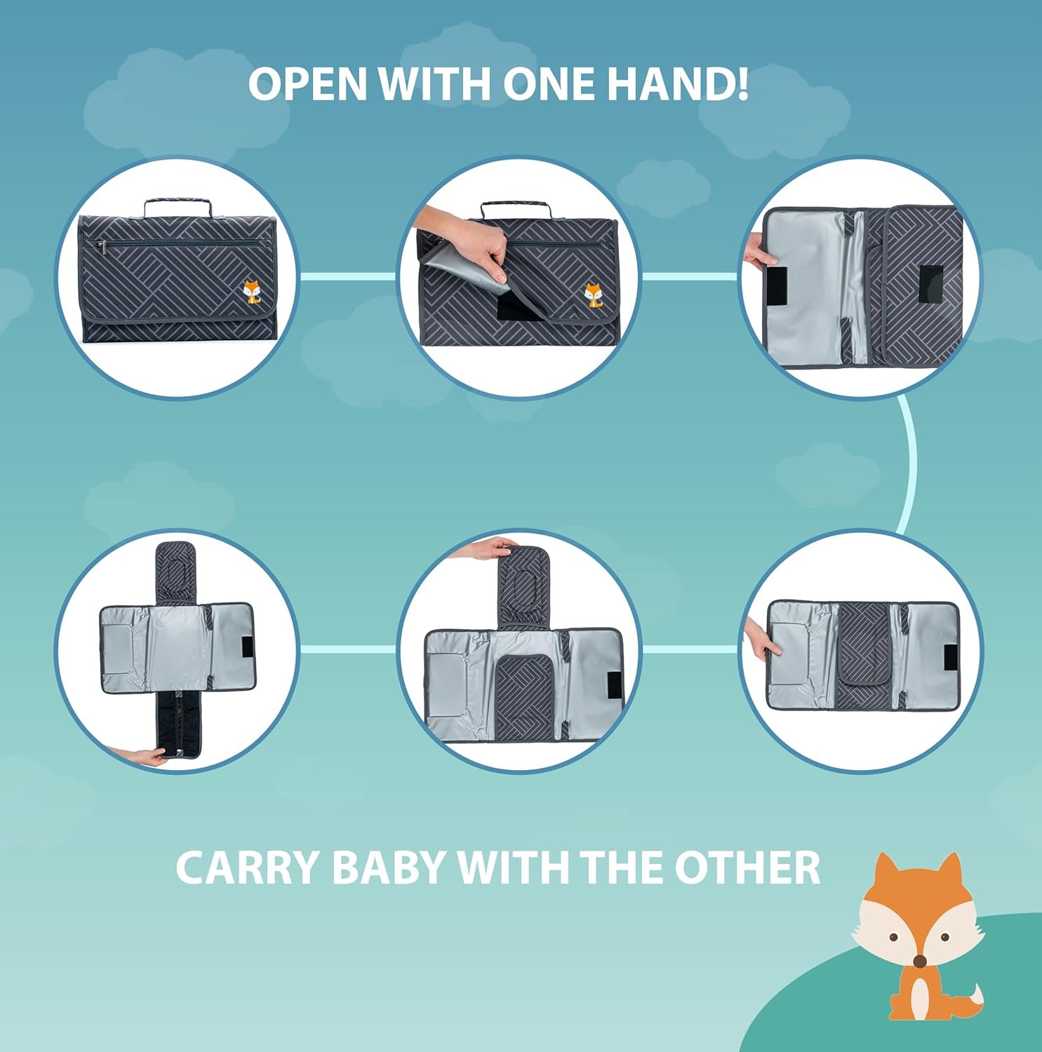 It’s hard enough to hold our wiggly lil cubs with two hands, let alone holding them while also struggling with diapers, wipes and creams. But now, you can forget about change pads with tricky plastic clips and hard to access pockets because the Lil Fox Portable Change Pad was created for a quick and nimble change! In fact, it’s the ONLY diaper pad that works with one hand, with everything you need on hand!
