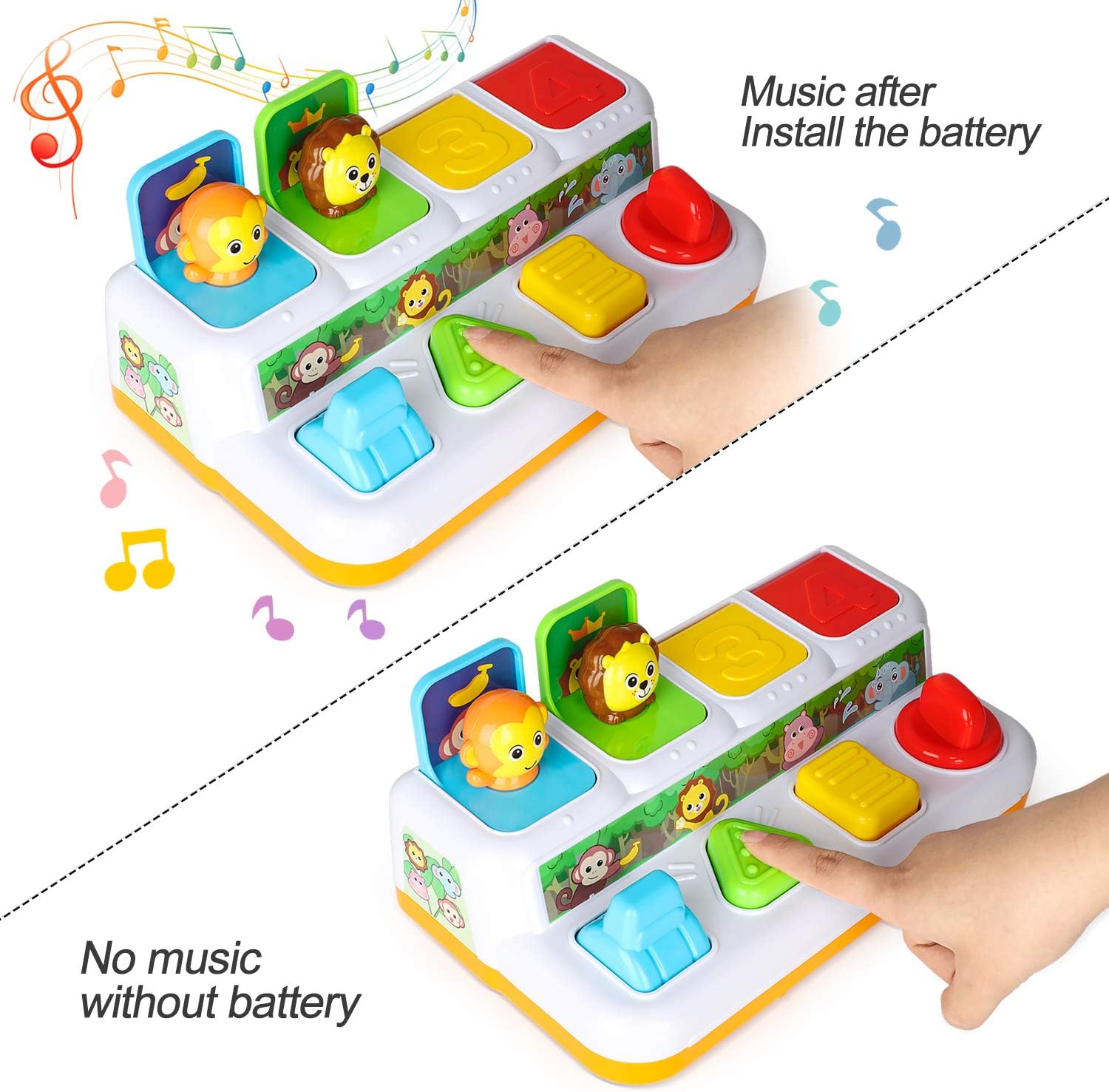 This baby toys 6-12 months will make different music when the animal pop up and close after install 2 AA batteries(not include) and turn on the switch , the volume of this baby toys 12-18 months can be adjusted. The animals can pop up even without batteries just no music.