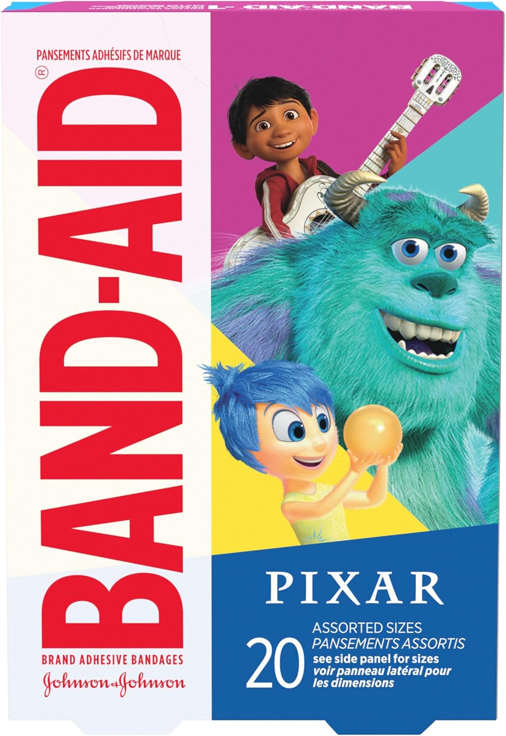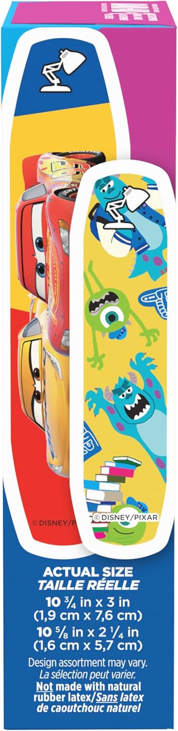 Care for your child’s minor cuts and scrapes and bring a smile to their face with Disney/Pixar Mashup Band-Aid Brand Adhesive Bandages. These first aid adhesive bandages for kids and toddlers cover minor cuts and scrapes to deliver daily wound care and healing protection. Perfect for kids and toddlers, these fun bandages feature Disney/Pixar Mashup characters from Toy Story, Finding Nemo, The Incredibles and more to make first aid more fun for your child. As part of your essential first aid supplies, the decorated bandages protect minor wounds from contact with germs and dirt. These sterile kids’ bandages come in various sizes and are comfortable to wear thanks to a non-stick pad that won’t adhere to the wound. The box contains individually wrapped bandages in assorted sizes. For best results, apply bandage to clean, dry skin. Change daily, when wet, or more often if needed. Disney/Pixar