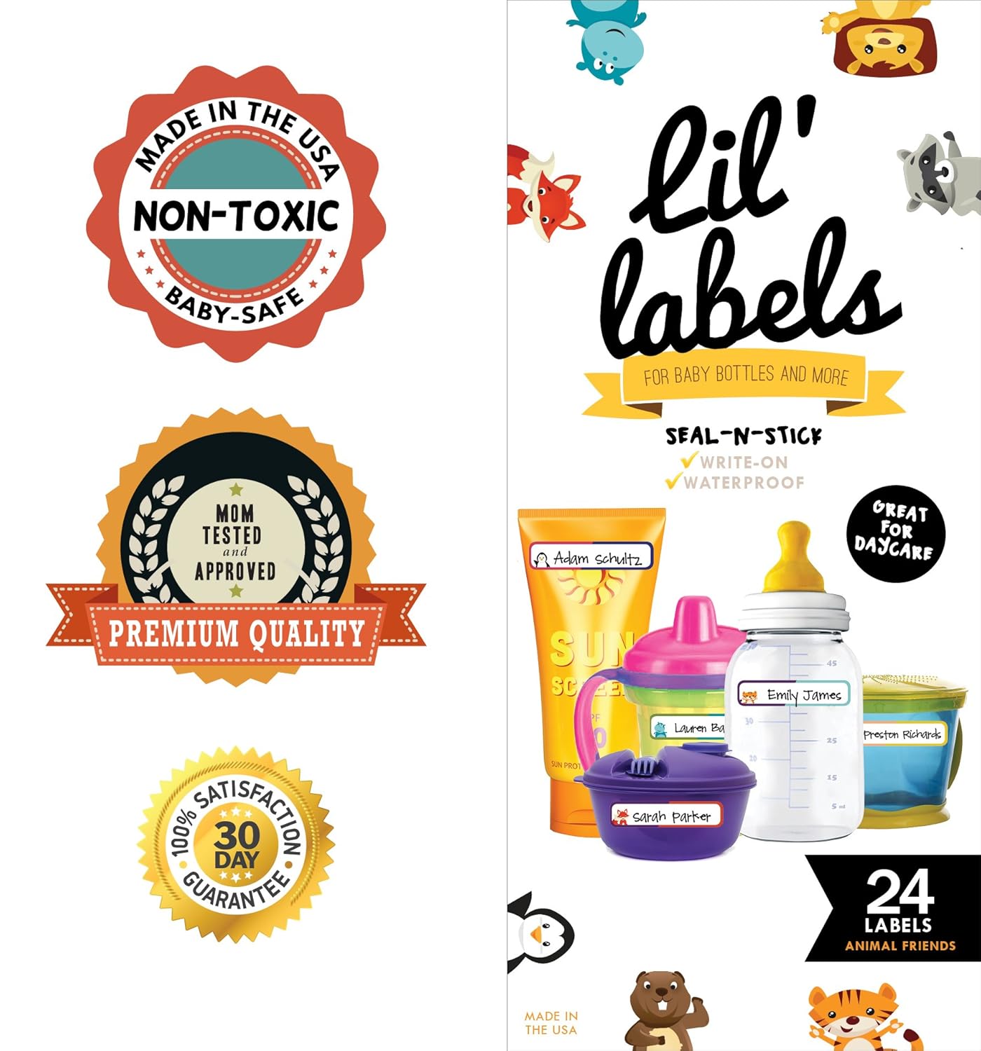 Bottle Labels, Write-On Name, Self-Laminating, Waterproof, Baby Bottle Label for Daycare, Made in The USA (Animal Friends Set of 2)