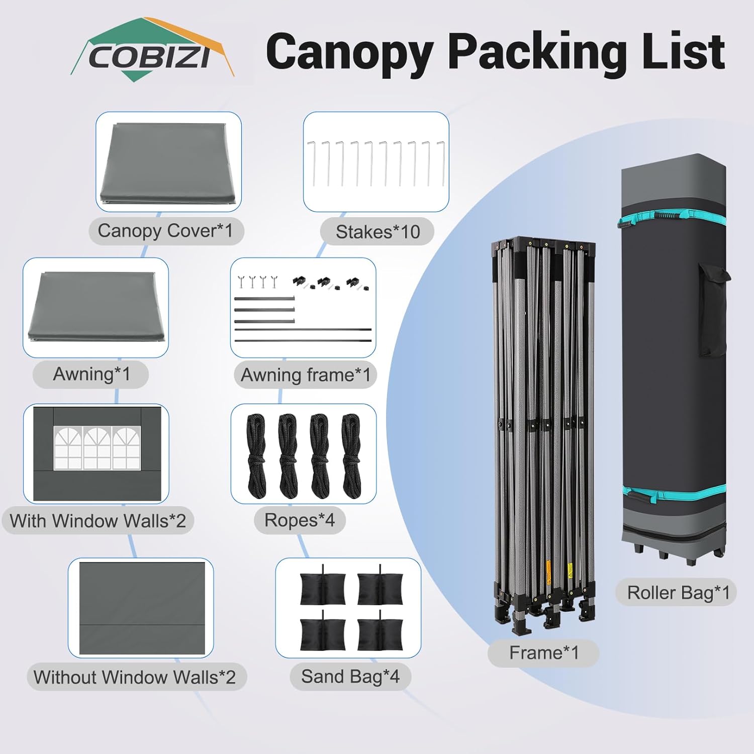 【Packing List & After-sales Service】COBIZI canopy with awning includes: frame x 1, awning x 1, awning bracket x 1, sidewall x 4, sandbag x 4, rope x 4, floor nail x 10, roller bag x 1. We are willing to provide you with good after-sales. If you have questions about the product during use, you are welcome to contact us