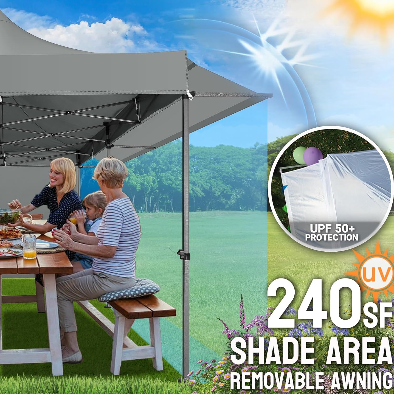 【Detachable 45SF Awning】The 10×20 pop-up canopy tent with awning provides an additional 45 SF of shaded space, providing a total coverage area of 232 SF. This allows the canopy tent to provide more shaded space for business activities or enjoyment, meeting various needs