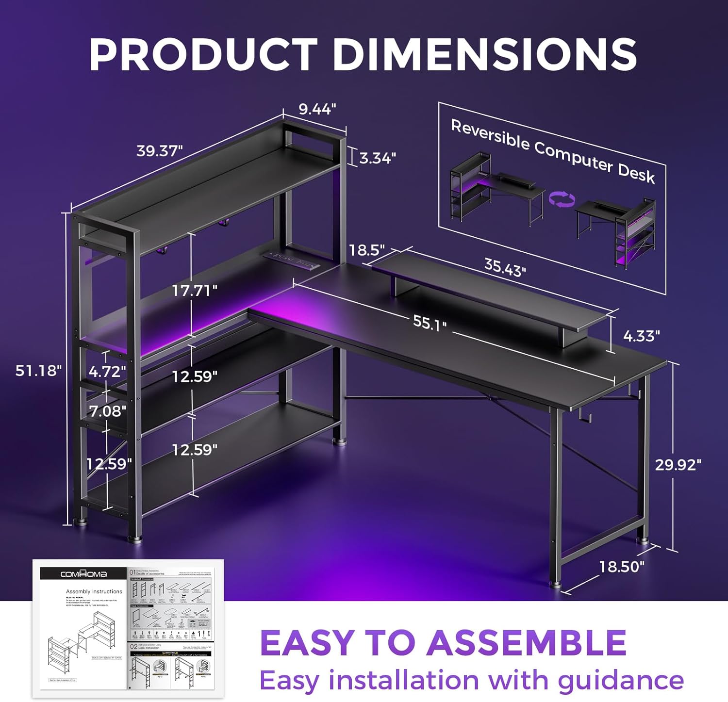 Be the first to review “COMHOMA L Shaped Desk Gaming Desk with LED Light & Power Outlet, 55 Inch Reversible L Shaped Computer Desk with Shelf & Monitor Stand, Corner Desk with Hook for Home Office Desk, Black”
