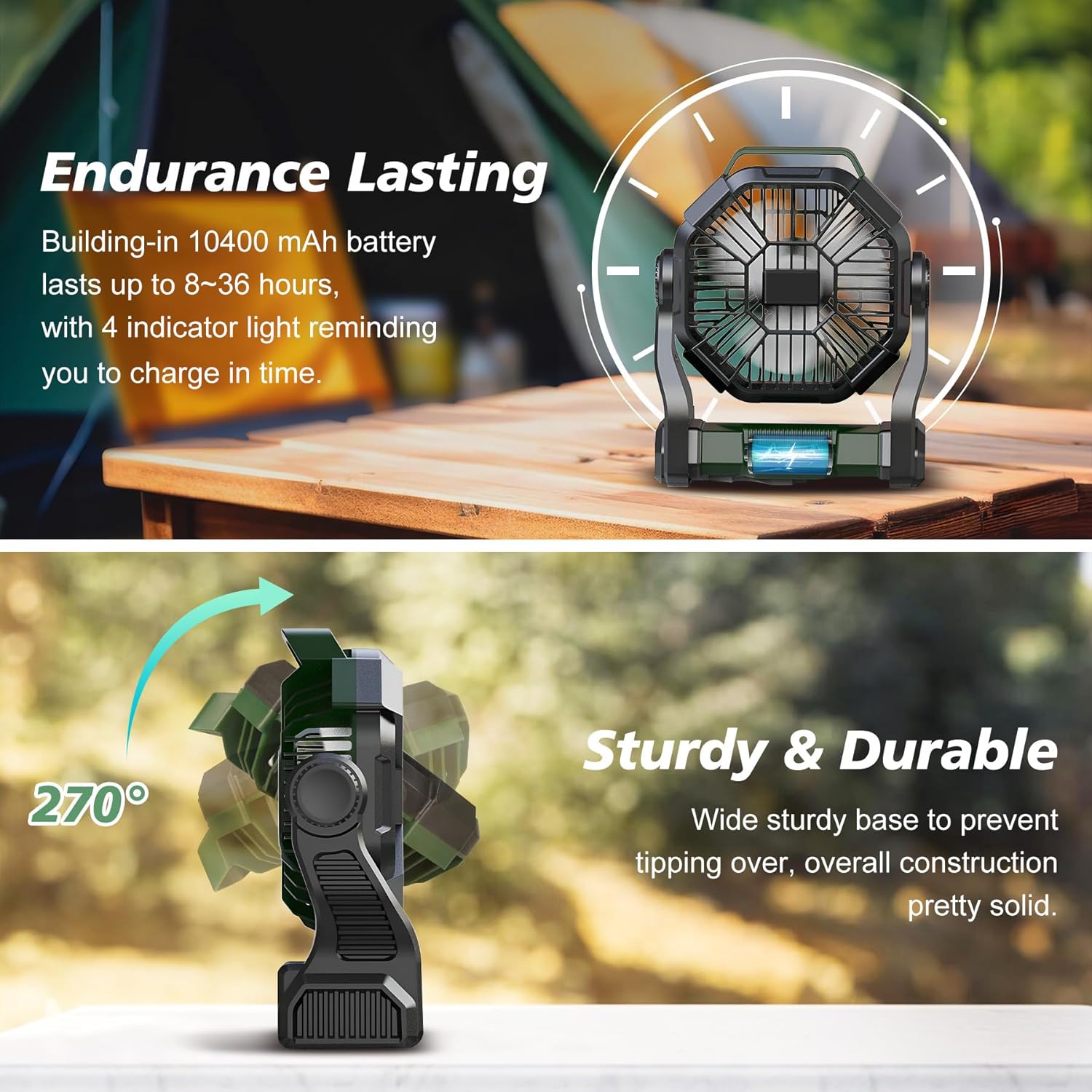 【Hanging Anywhere & Durable】: The battery powered fan is equipped with hooks in the bottom, it allows for effortless hanging from a variety of structures including tents, umbrellas, and hammocks. 270° rotation adjustment, more flexibility, enabling you to direct airflow precisely where it’s needed, enhancing the overall comfort of your space and it standing up to the challenges presented by outdoor.