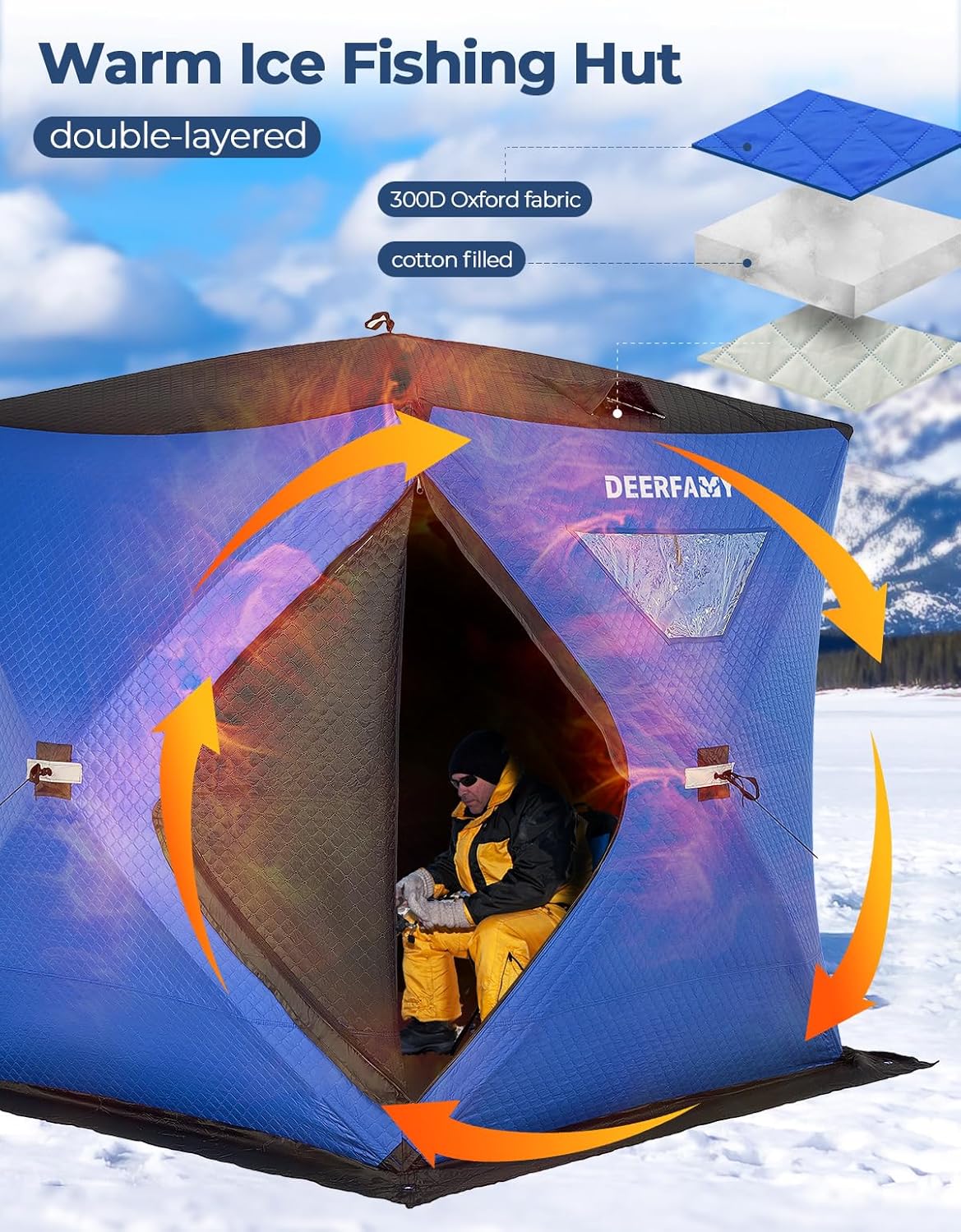 DEERFAMY 3-Layer Ice Fishing Shelter Cotton Filled, 3/4/5/6/7/8 Person Ice Fishing Tent, Pop up Ice Shanty Insulated Tent with Carrying Bag, Ice Anchors, Red/Blue