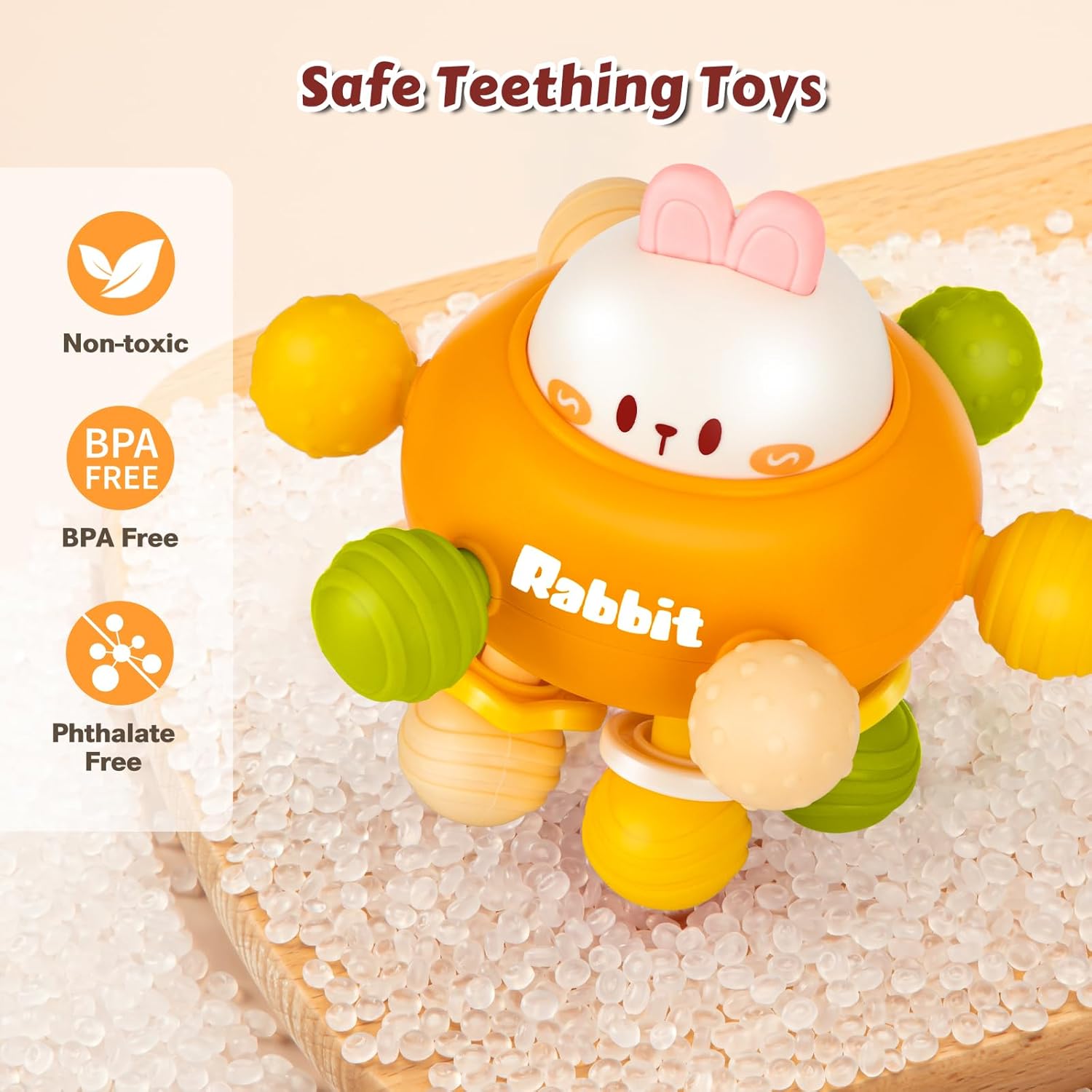 Baby Sensory Teething Toys: Bunny shape is perfect for Easter Basket Stuffers Gifts. Our rabbit teether baby rattle toy features 11 different color and texture chew points to soothe teething babies and relieve discomfort caused by sore gums. The rotating bunny head makes crunching sounds for more sensory fun