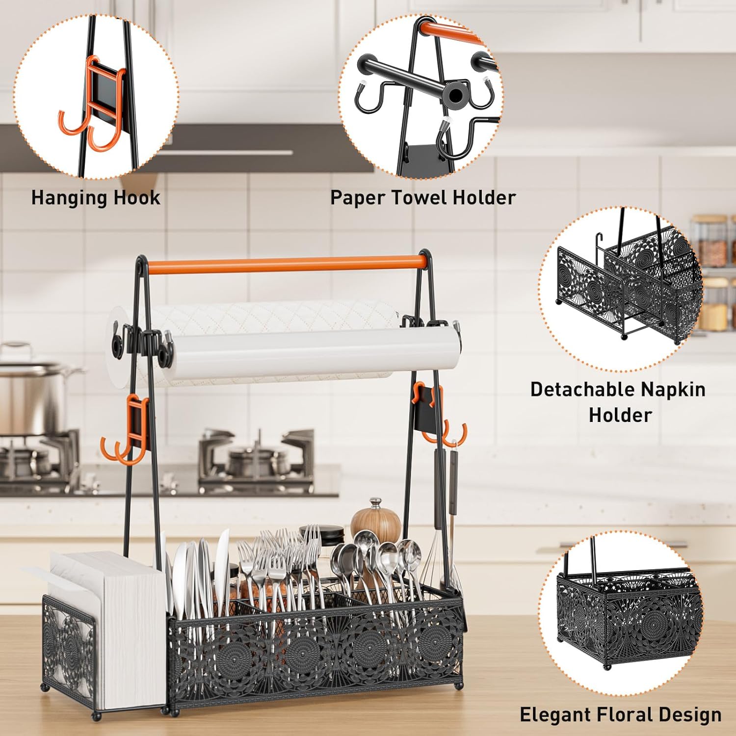 Our utensil caddy basket is not only suitable for outdoor use, but also fits well indoors. It can effectively organize your flatware and condiments, and the additional paper towel holder also allows you to store an ample supply of paper towels for use.
