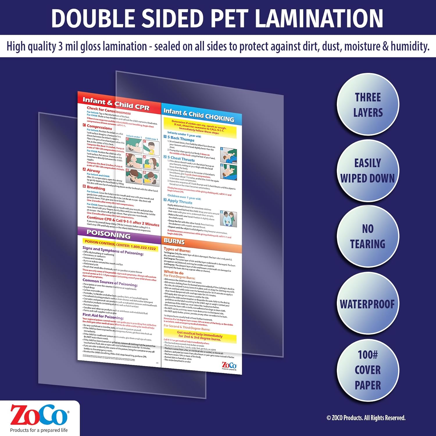 LIFESAVING INFORMATION — This invaluable child safety product includes 1) CPR steps for babies and children, 2) Choking / Heimlich Manuever first aid for babies and children, 3) Signs and symptoms of poisoning and poisoning first aid for babies and children, and 4) Types of burns and first aid for burns for babies and children.