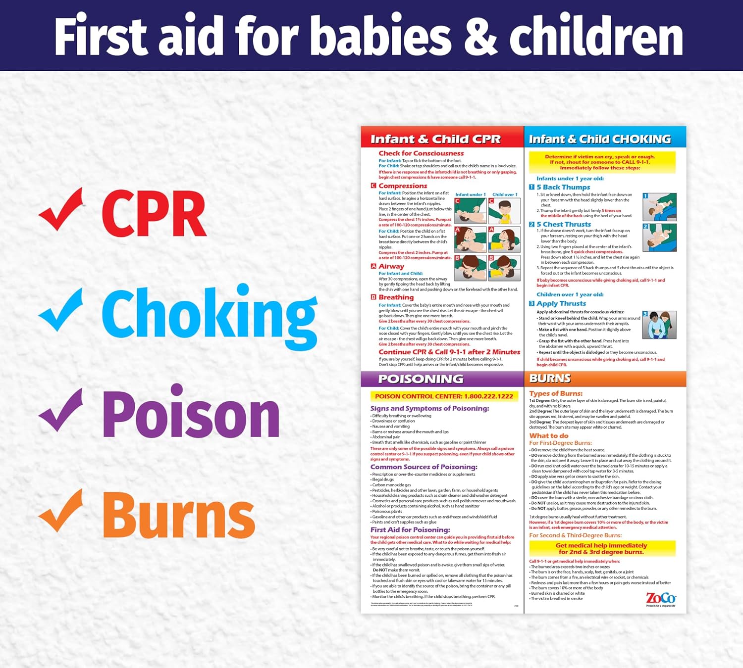 LIFESAVING INFORMATION — This invaluable child safety product includes 1) CPR steps for babies and children, 2) Choking / Heimlich Manuever first aid for babies and children, 3) Signs and symptoms of poisoning and poisoning first aid for babies and children, and 4) Types of burns and first aid for burns for babies and children.