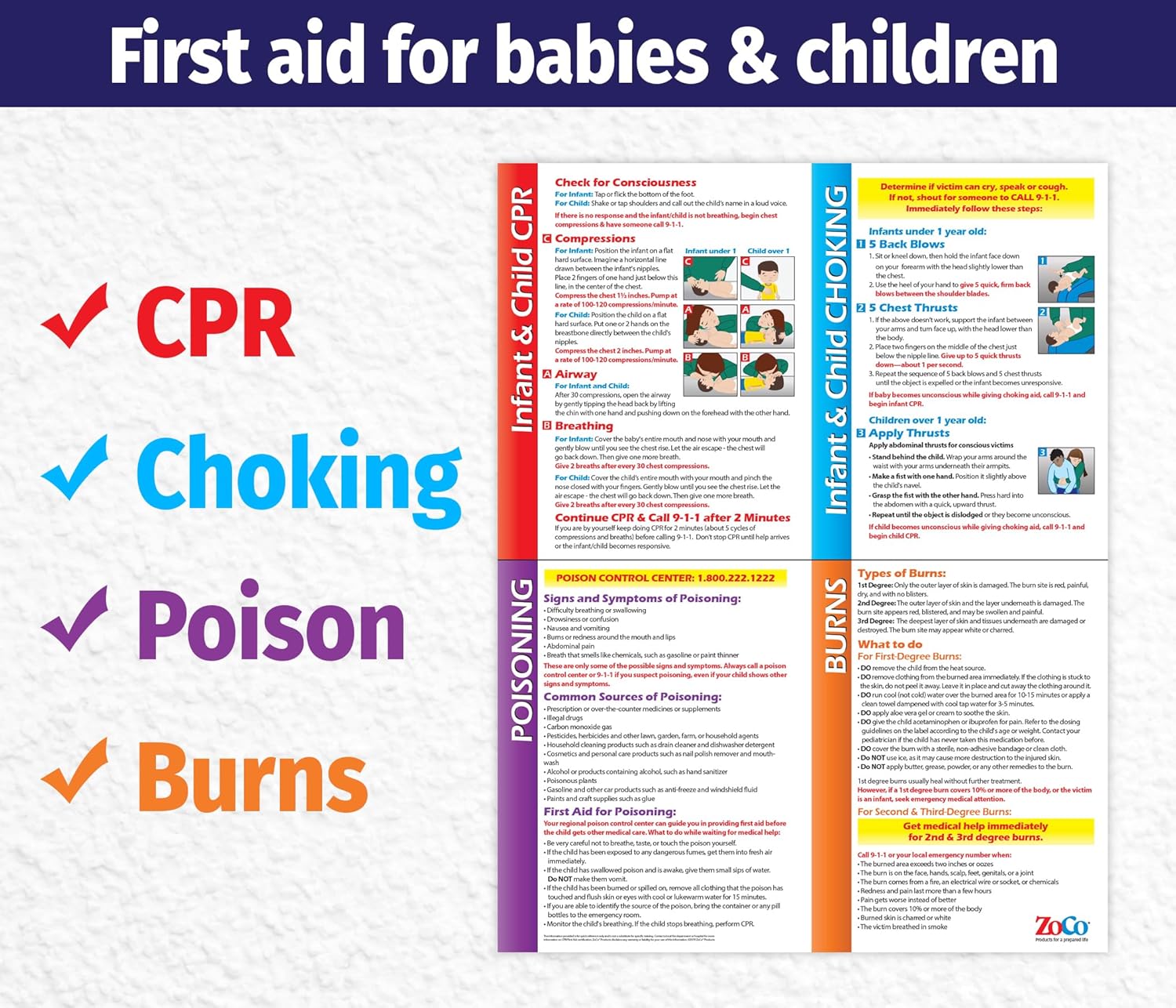 🔸 LIFESAVING INFORMATION — This invaluable child safety product includes 1) CPR steps for babies and children, 2) Choking / Heimlich Manuever first aid for babies and children, 3) Signs and symptoms of poisoning and poisoning first aid for babies and children, and 4) Types of burns and buns first aid for babies and children.