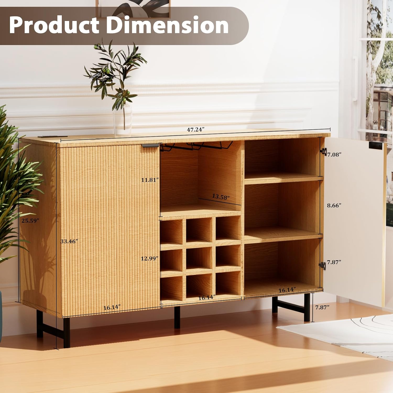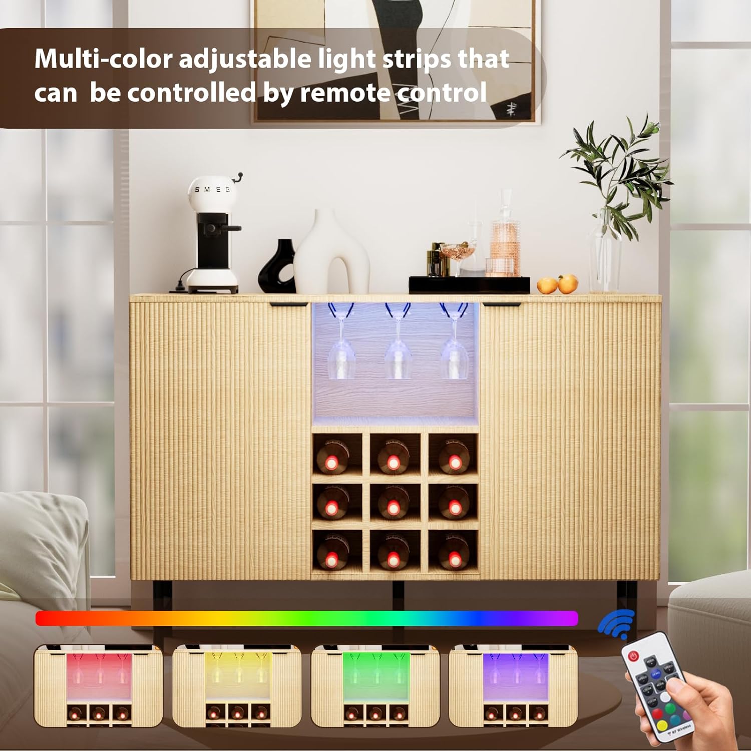 Fluted Wine Bar Cabinet with Power Outlets and LED Lights, Modern Coffee Bar Furniture for Home, Liquor Cabinet with Wine Rack, Sideboard Buffet Cabinet for Kitchen, Wood Grain