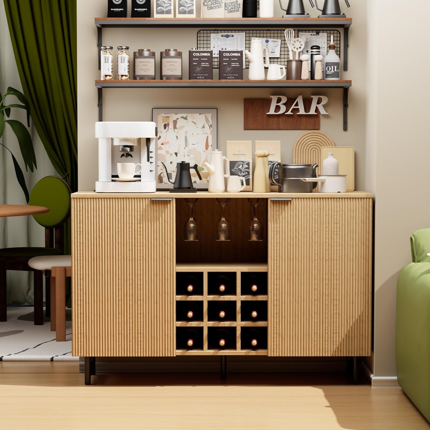 Abundant Storage Space: Combining wine racks, cup holders, and storage compartments, this wine cabinet offers an open central storage area, three rows of glass racks (each holding 3 glasses), a 9-bottle wine rack, and two side cabinets with doors. All shelves are adjustable to meet your storage needs; the spacious tabletop is perfect for placing coffee machines, microwaves, or other items.
