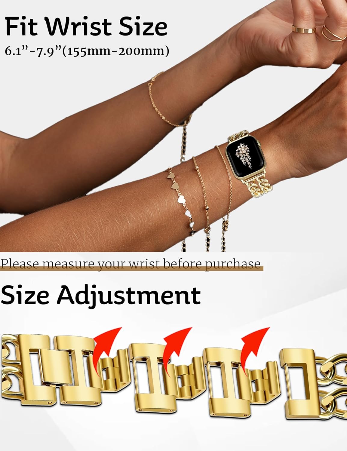 Gold Chain Watch Bands for Women Compatible with Apple Watch Band 38mm 40mm 41mm 42mm (S10) Dressy Adjustable Cowboy Metal Band Link Bracelet for iWatch Series1/2/3/4/5/6/7/8/9/10/SE (No Case)
