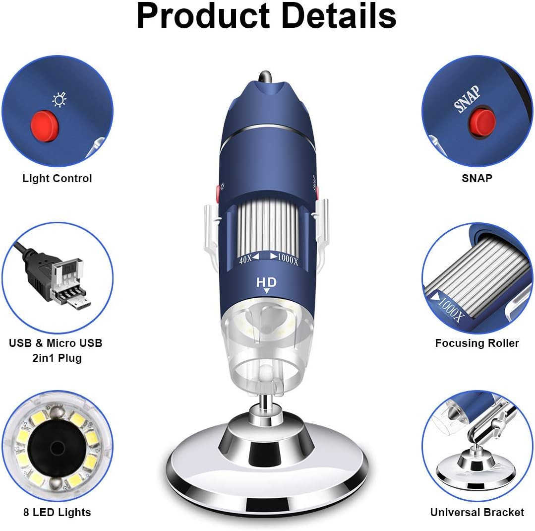 HD 2MP USB Microscope Camera for Android Windows Linux Mac, 40X to 1000X Digital With Stand & Carrying Case, Portable Coin for Adults Kids Students
