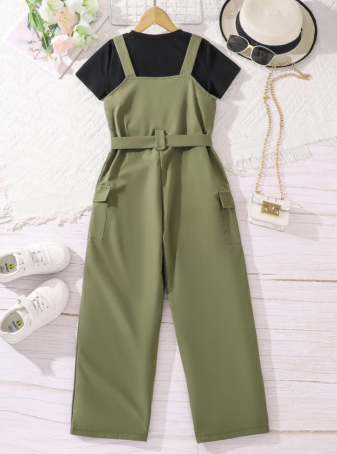 Hilinker Girl’s Casual Two-Piece Summer Outfit – Crew Neck T-shirt with Loose Cargo Jumpsuit.