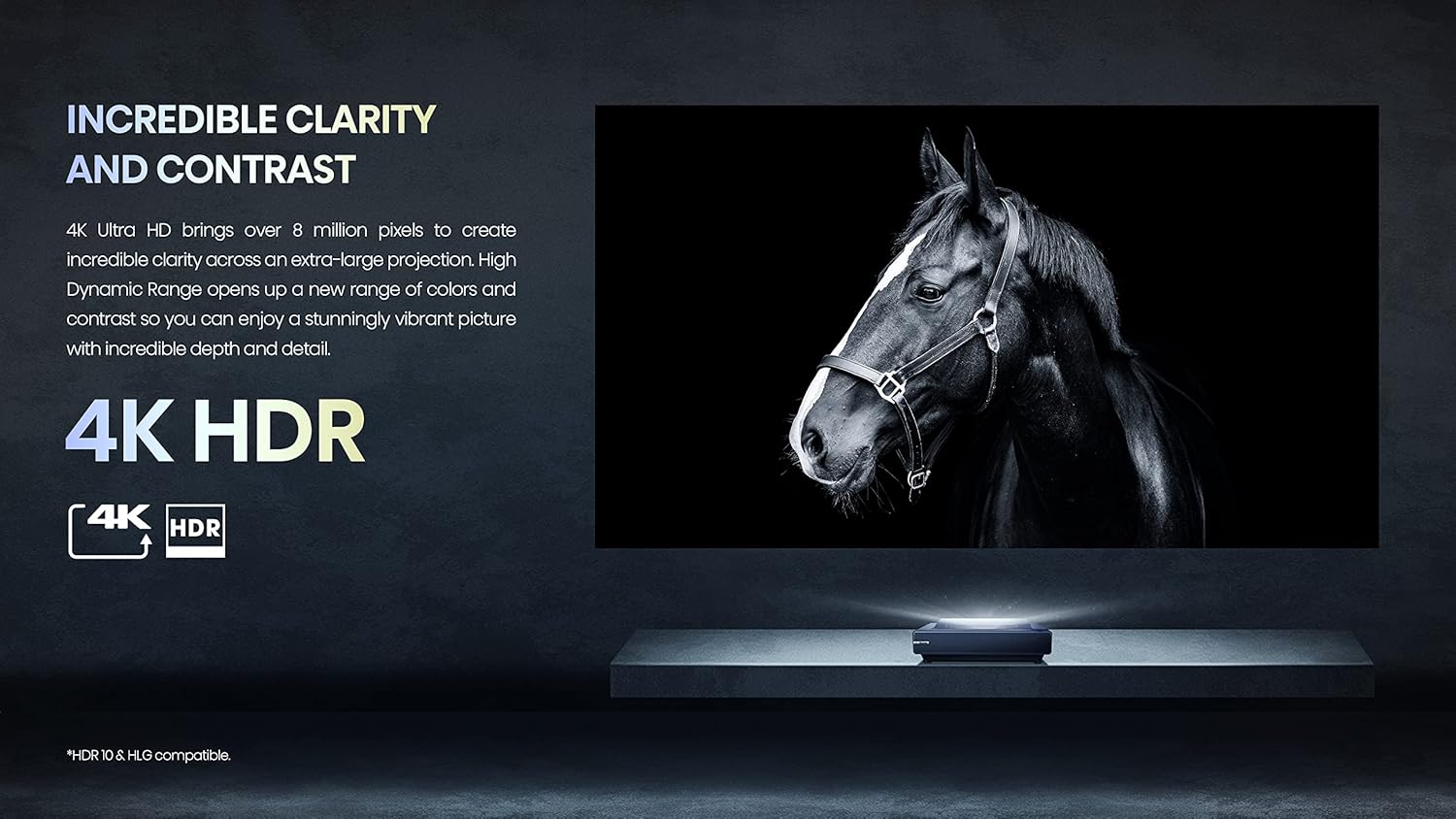 4K UHD, HDR10: 4K Ultra HD brings more than 8 million pixels to life with incredible clarity across the extra-large projection. High-Dynamic Range expands color and contrast for greater vibrance, depth, and detail.