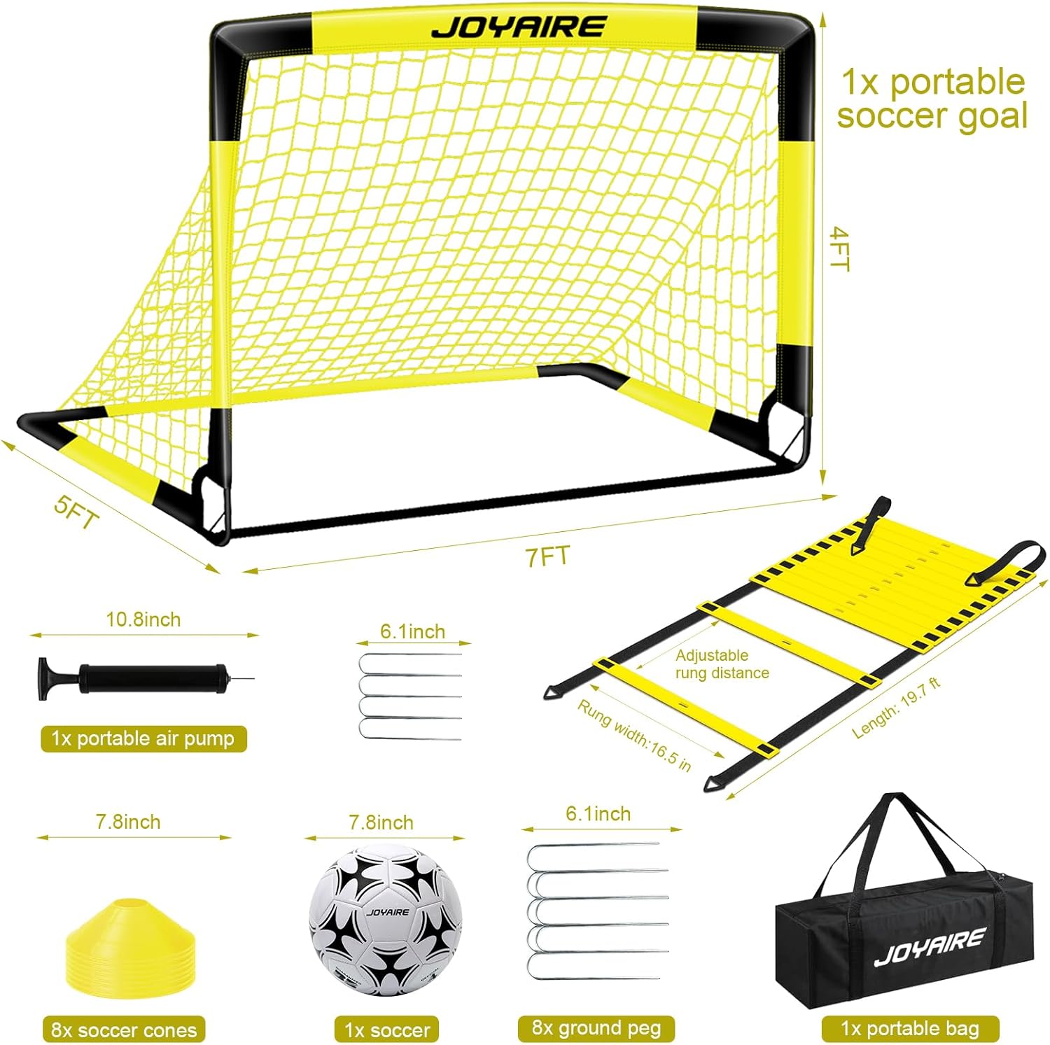 “Complete & Valuable Kids Soccer Net Set” : includes all soccer stuff accessories. Come with 1 7×5 Portable soccer goals, 1 std size 4 soccer ball, 1 carrying bag, 1 inflation air pump, 8 soccer cones, 1 agility ladder and 8 U-shaped heavy-duty ground stakes. You can start playing right away once you get the product—no need to purchase any extra accessories or soccer training equipment. This is a fantastic soccer gifts for kids for Christmas or the New Year!