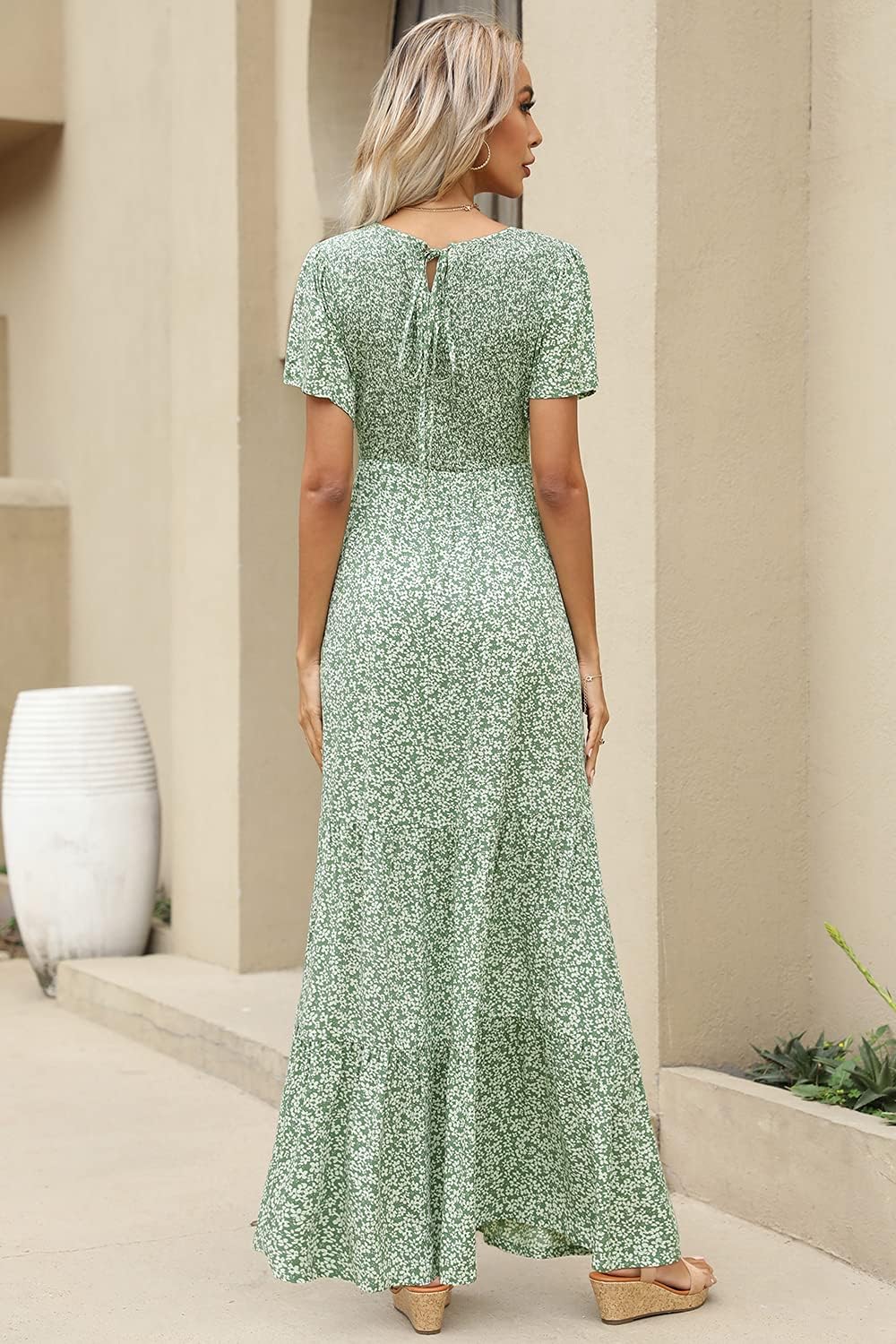 Women Summer Short Sleeve Smocked Beach Maxi Dress