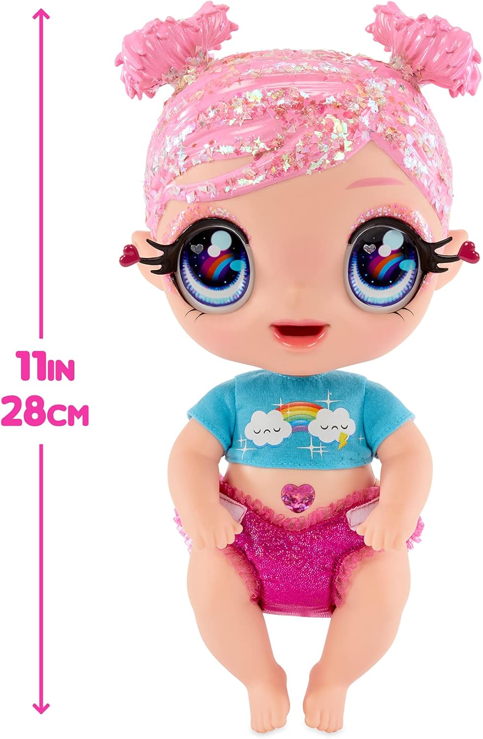 MGA Entertainment Glitter BABYZ DREAMIA Stardust Baby Doll with 3 Magical Color Changes, Pink Hair Rainbow Outfit, Diaper, Bottle, Pacifier Accessories- Ages 3 4 5+ Years Old, Multicolor, (574842EUC)