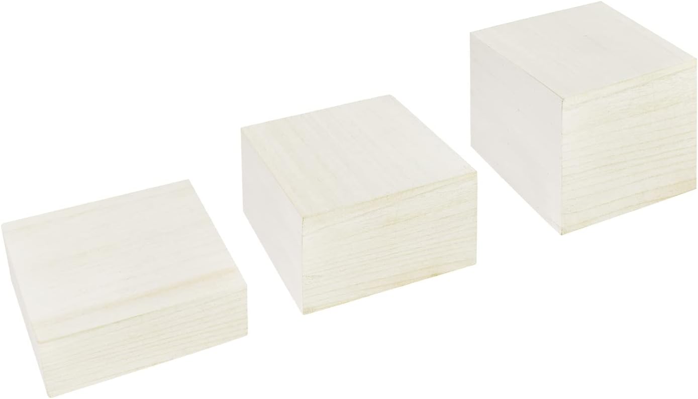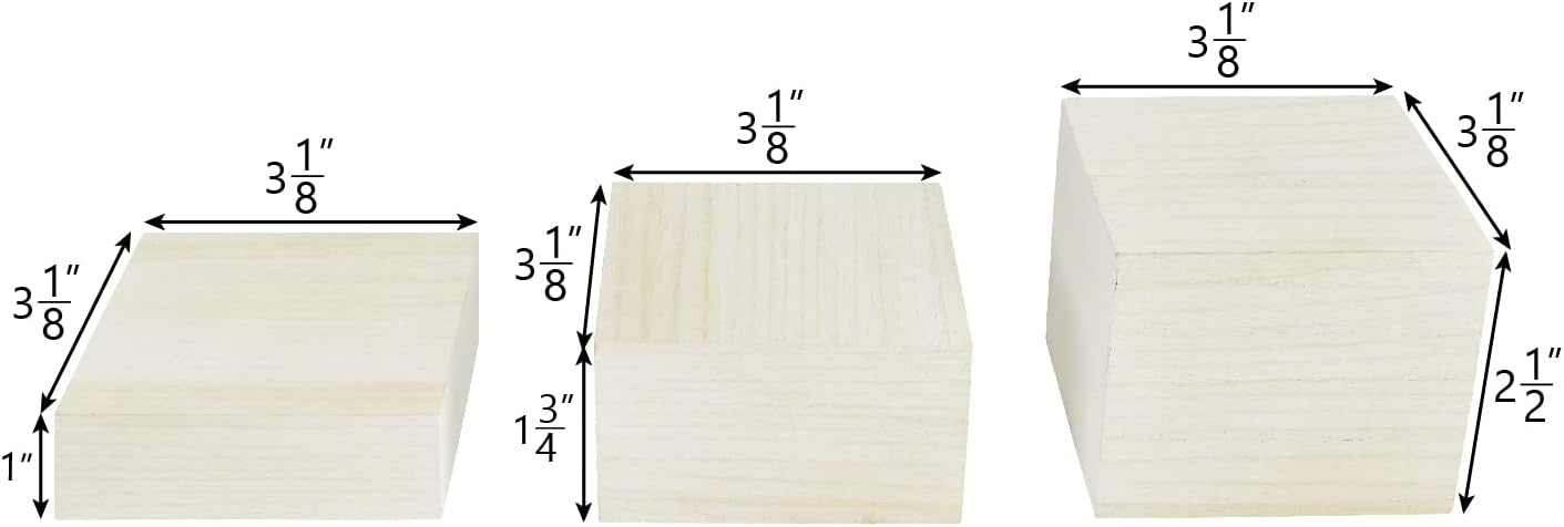 MATERIAL & SIZE – Wood; 3 1/8″W x 3 1/8″D x 1″H, 3 1/8″W x 3 1/8″D x 1 3/4″H, 3 1/8″W x 3 1/8″D x 2 1/2″H