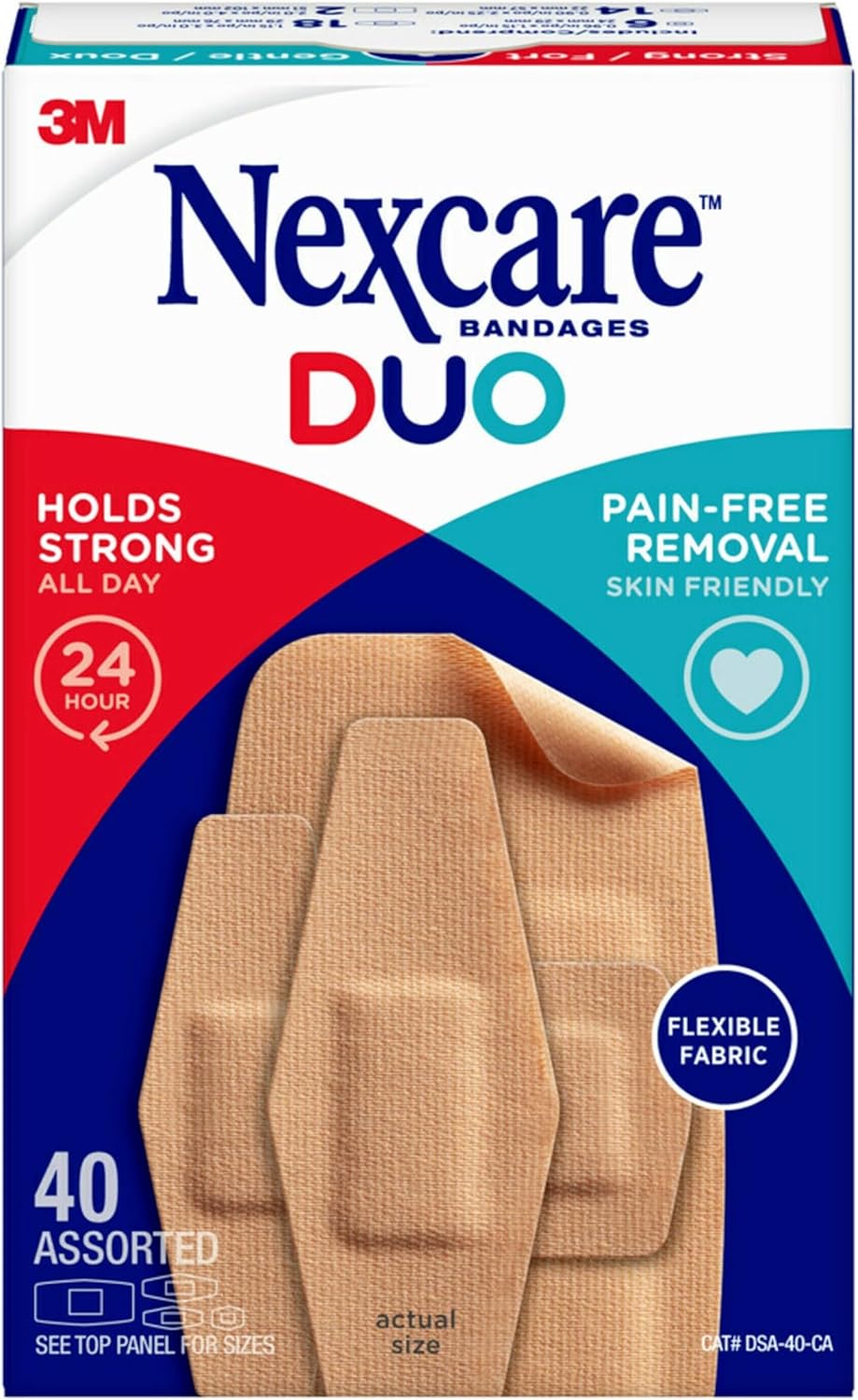 Nexcare Duo Bandages, Painless Removal, Strong Adhesive Bandages Stay on for 24 Hours, Flexible Fabric Construction – 40 Pack Assorted Adhesive Bandages