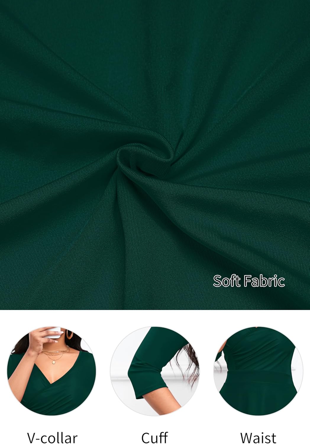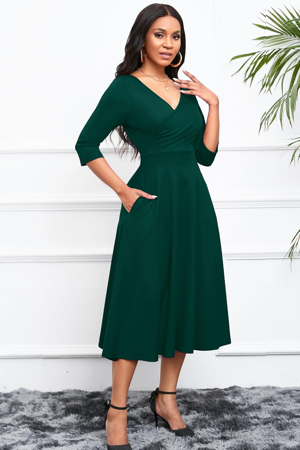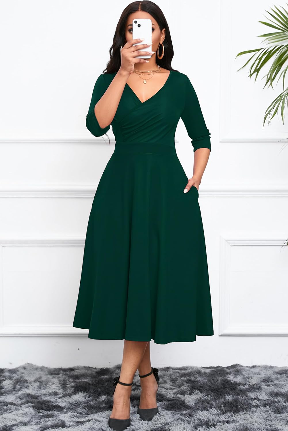 Nmoder Women’s Casual Wrap Flared Midi Dress Wedding Guest Cocktail Tea Dresses A-Line Swing V-Neck 3/4 Sleeve