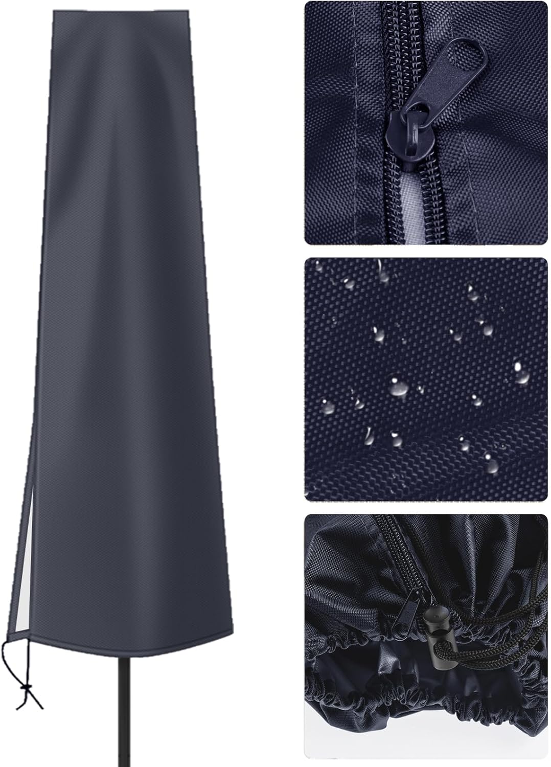 Long Zip Disign: Long zipper makes it easy to put on the umbrella. The drawstring at the bottom cinches it up, it won’t blow off by the strong wind. The zipper is smooth and durable, and the included rod makes the patio table umbrella cover easy to install and remove.