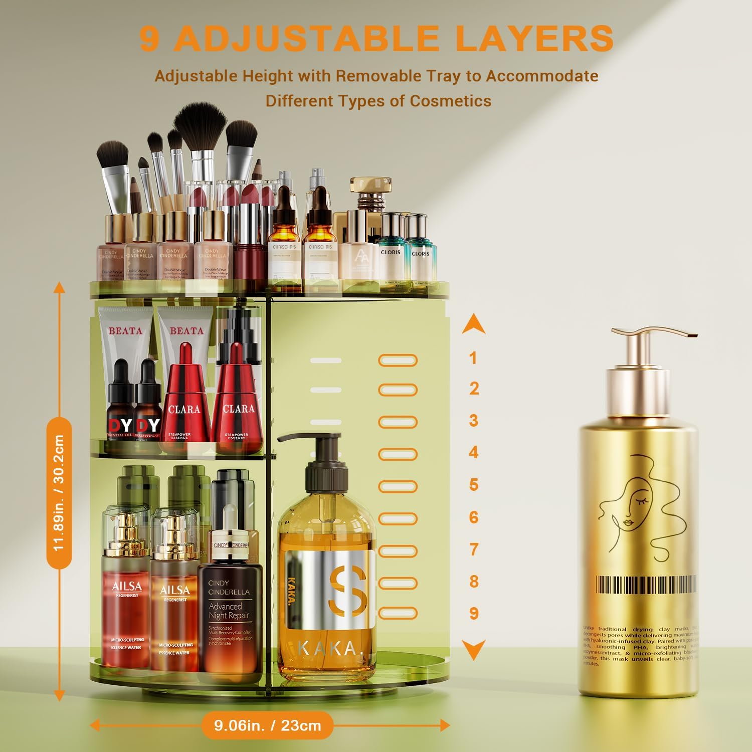 Rotating Makeup Organizer, DIY 9 Adjustable Layers Spinning Skincare Organizer, Bathroom Organizer with Brush Holder Perfume Tray, Multi-Function Storage Carousel for Vanity Bathroom Countertop