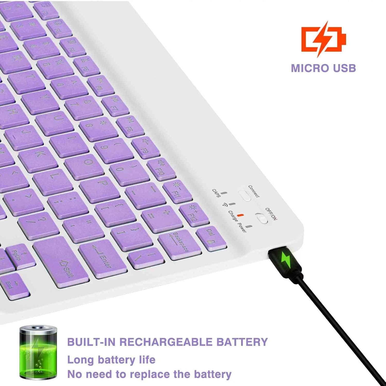 ECO-FRIENDLY TECHNOLOGY & RECHARGEABLE BATTERIES — The Bluetooth keyboard has a remarkably long-lasting rechargeable battery inside that allows for up to 90 hours of nonstop typing on a single charge. It has an energy-saving mode for environmental conservation that puts the keyboard to sleep after 30 minutes of inactivity to reduce wasteful energy use.