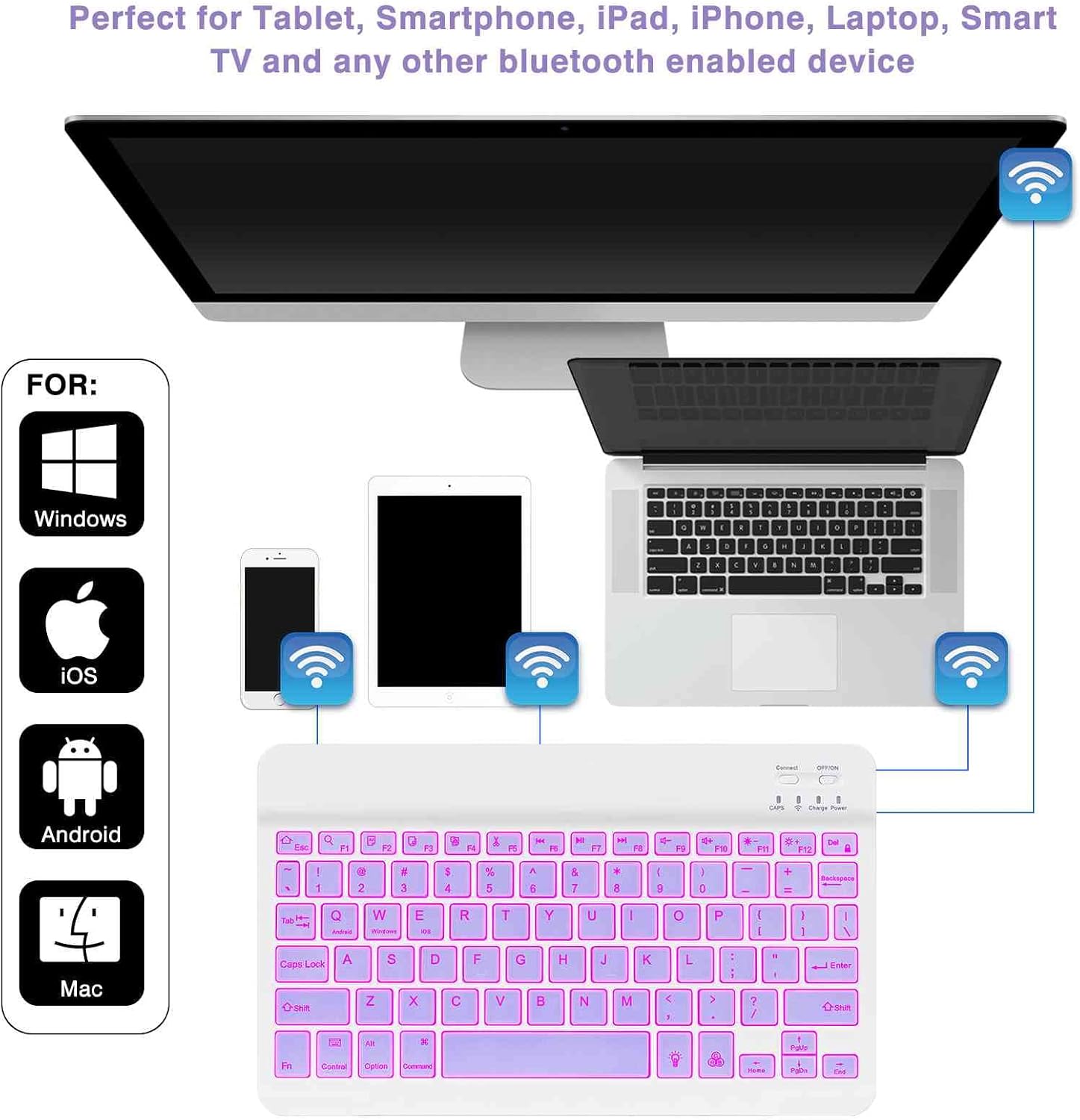 EXCEPTIONAL APPEARANCE & ERGONOMIC DESIGN — The UrbanX Bluetooth keyboard is made of premium ABS, has feet that maintain it at an ideal slope, and is designed to reduce wrist pain over extended periods of typing. A chic backlit color scheme offers it a refined and alluring appeal. the slim lightweight design and backlit keys all help working with your wireless Bluetooth and 2.4GHz keyboard on the go, and in any lighting situation.