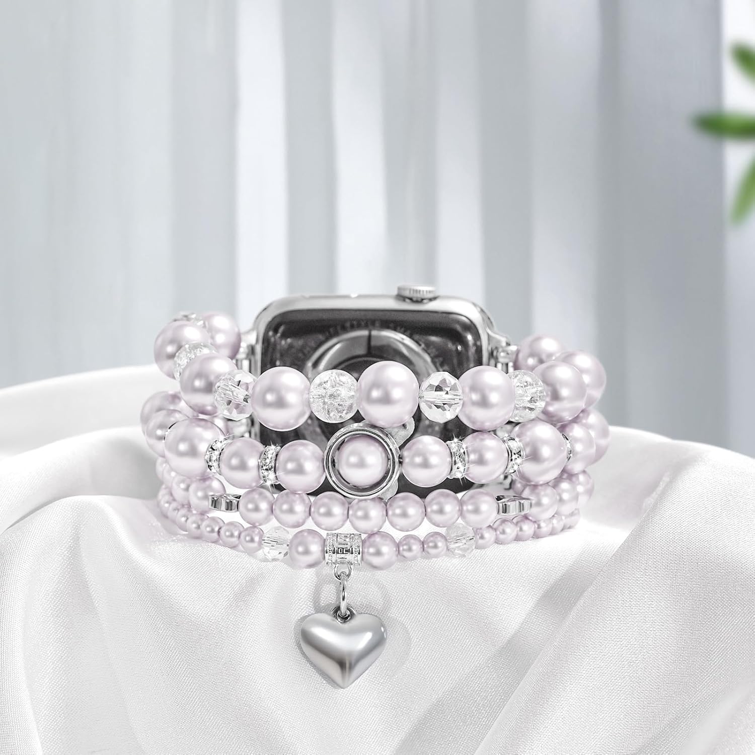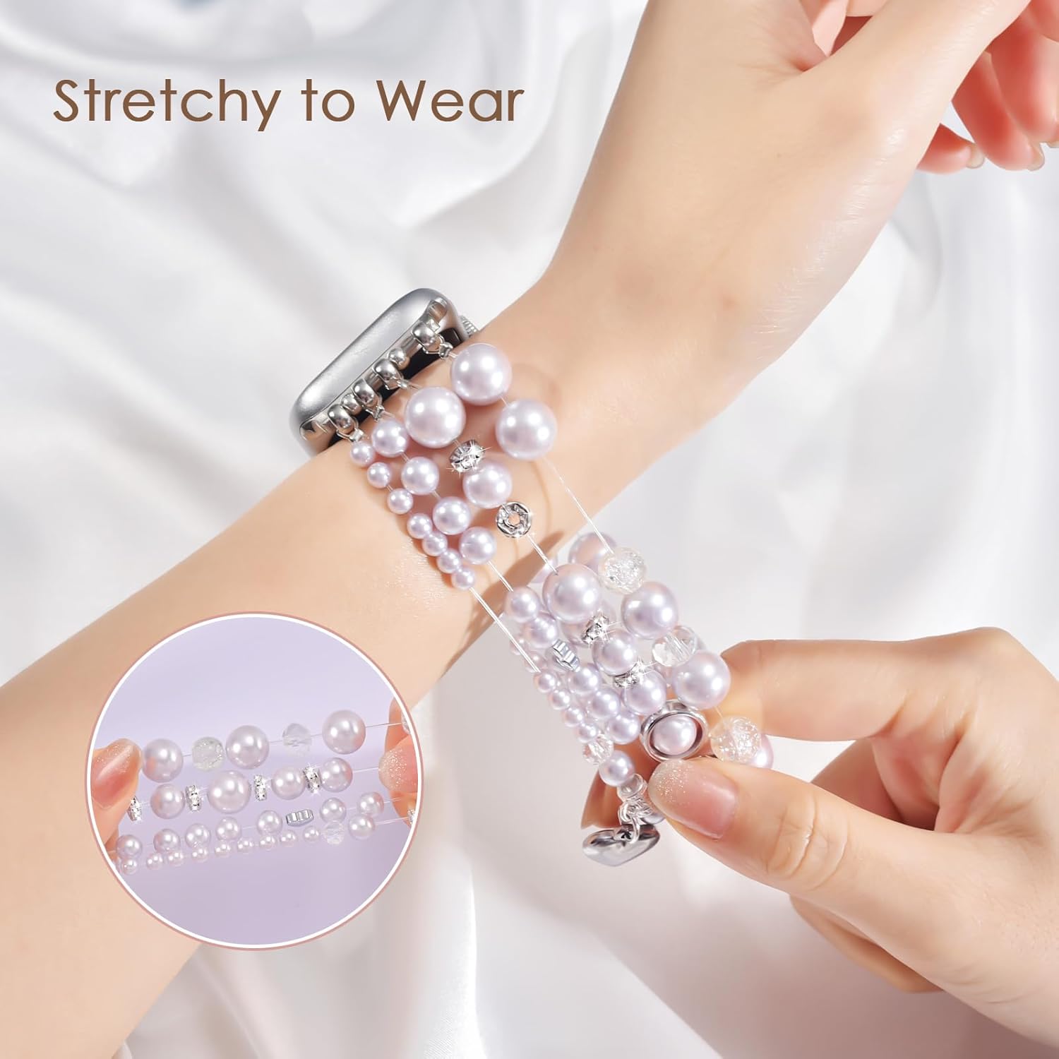 V-MORO Compatible with Apple Watch Band Pearl Series 10(42mm)/9/8/7 41mm/40mm Women Fancy Beaded Elastic Bracelet Bling Jewelry Strap for iwatch SE Series 6/5/4/3/2/1 Lavender,for 5.5″-6.2″ Wrist