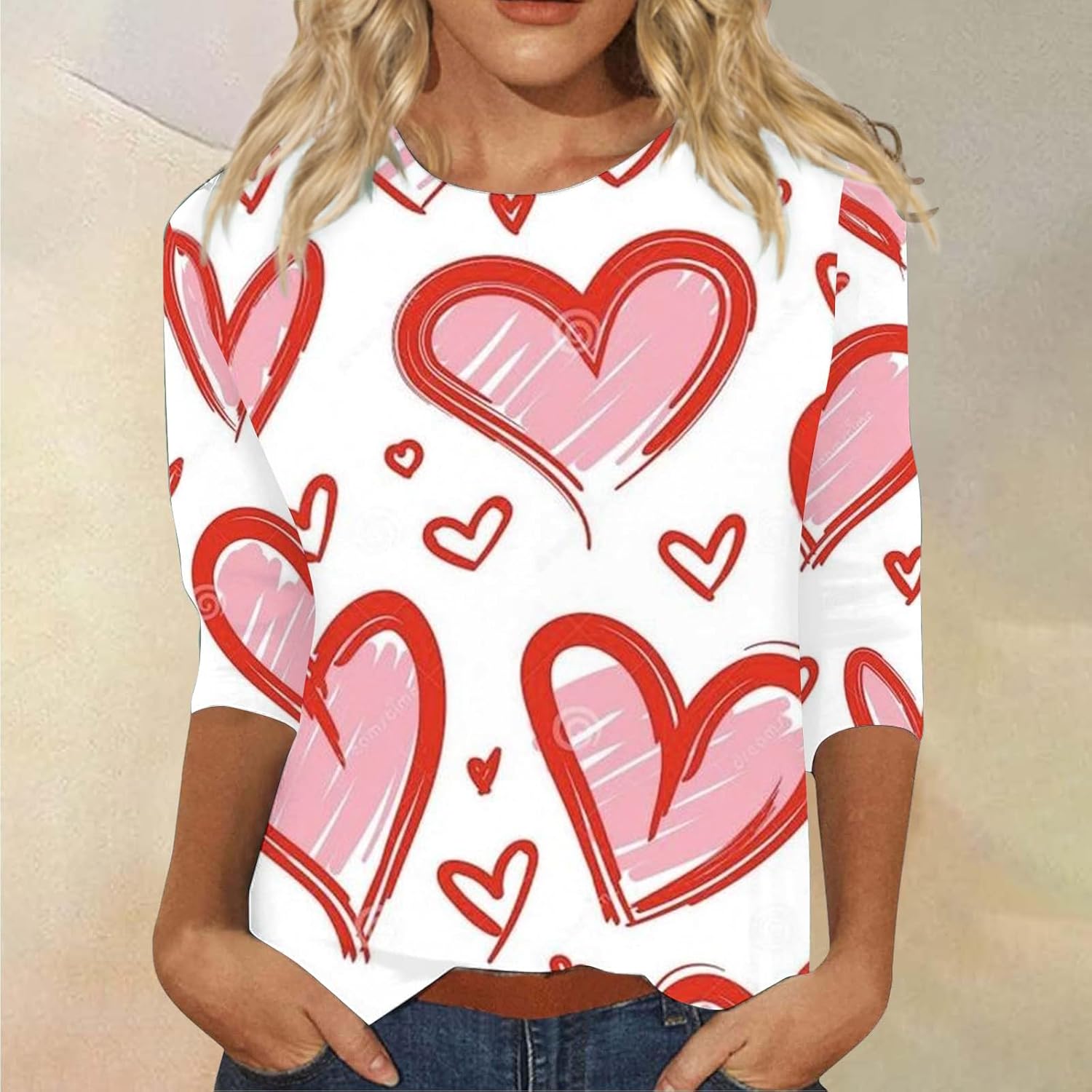 Valentine’s Day Shirts for Women 2025 Trendy Love Heart Graphic Cotton Crewneck Tees 3/4 Sleeve Casual Blouses