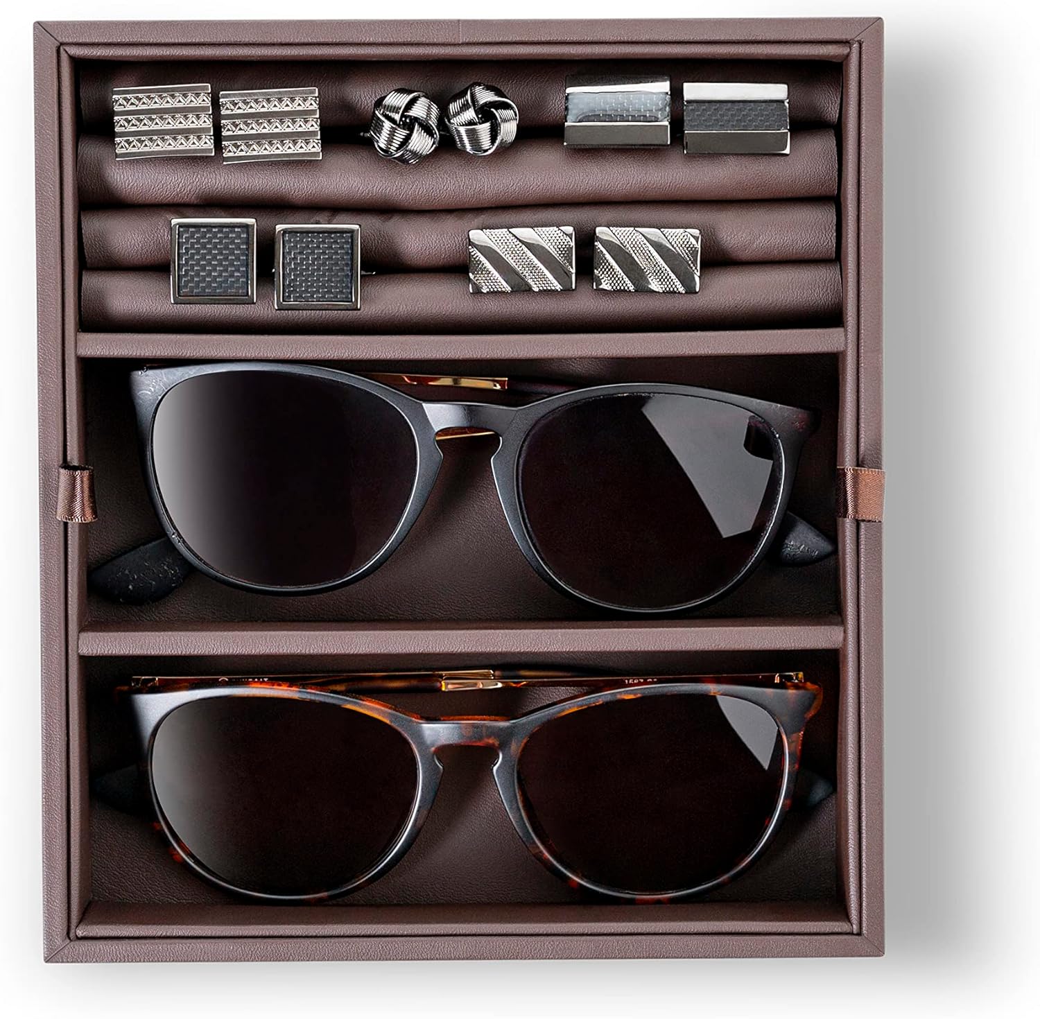 Be the first to review “Valet Jewelry Box for Men – Holds 6 Watches, 12 cufflinks, 2 Sunglasses & Tray Storage – Mens Watch Case – Organizer w Metal Accents, PU Leather & Large Glass Lid – Brown”