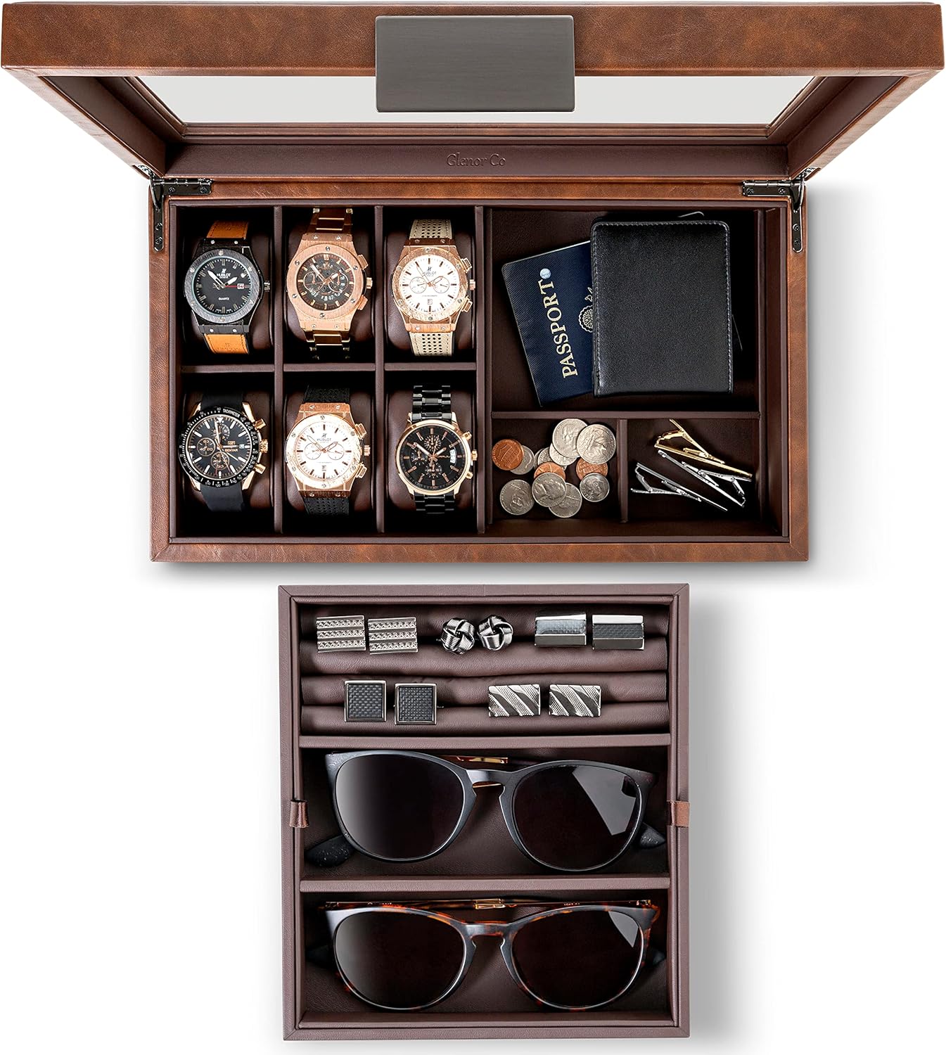 Glenor Co Valet Jewelry Box for Men – Holds 6 Watches, 12 cufflinks , 2 Sunglasses & Tray Storage – Mens Watch Case – CarbonFiber Organizer w Metal Accents, PU Leather & Large Glass Lid – Brown