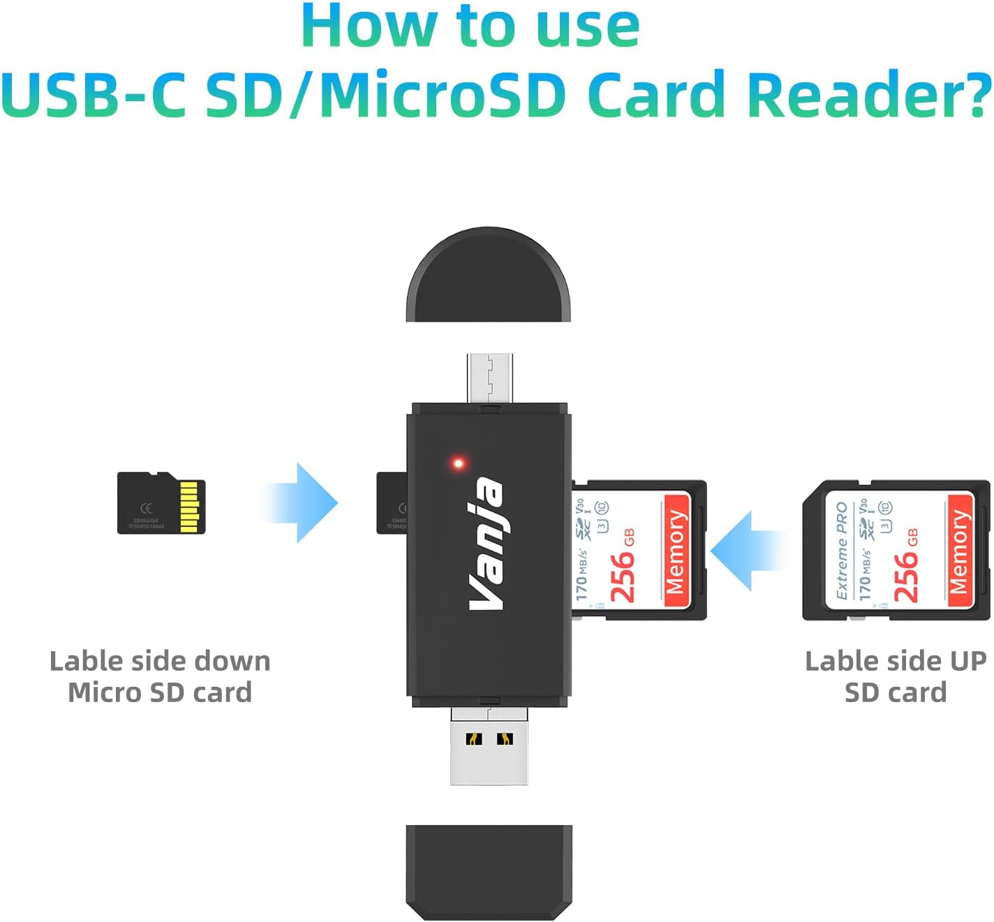 Multi-Function Design: Vanja mini USB Card adaptor set the USB plug, Micro USB plug and USB C plug in one, making this storage card reader compatible with all USB C device and tablets and Android smart mobile phones that support OTG function.