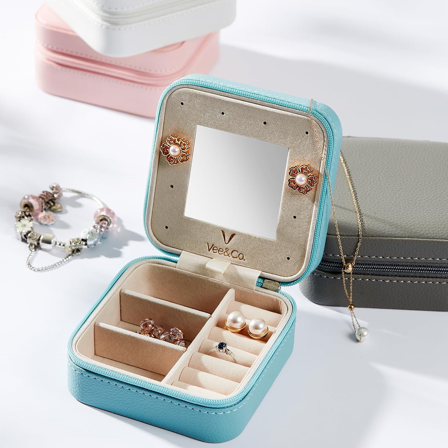 VEE&CO. Women’s Day Gifts 2024 Small Travel Jewelry Case, Mini Jewelry Organizer with Mirror Portable Display Storage Jewelry Box for Earrings, Rings, Necklaces, Bracelet for Women Girls (Blue)
