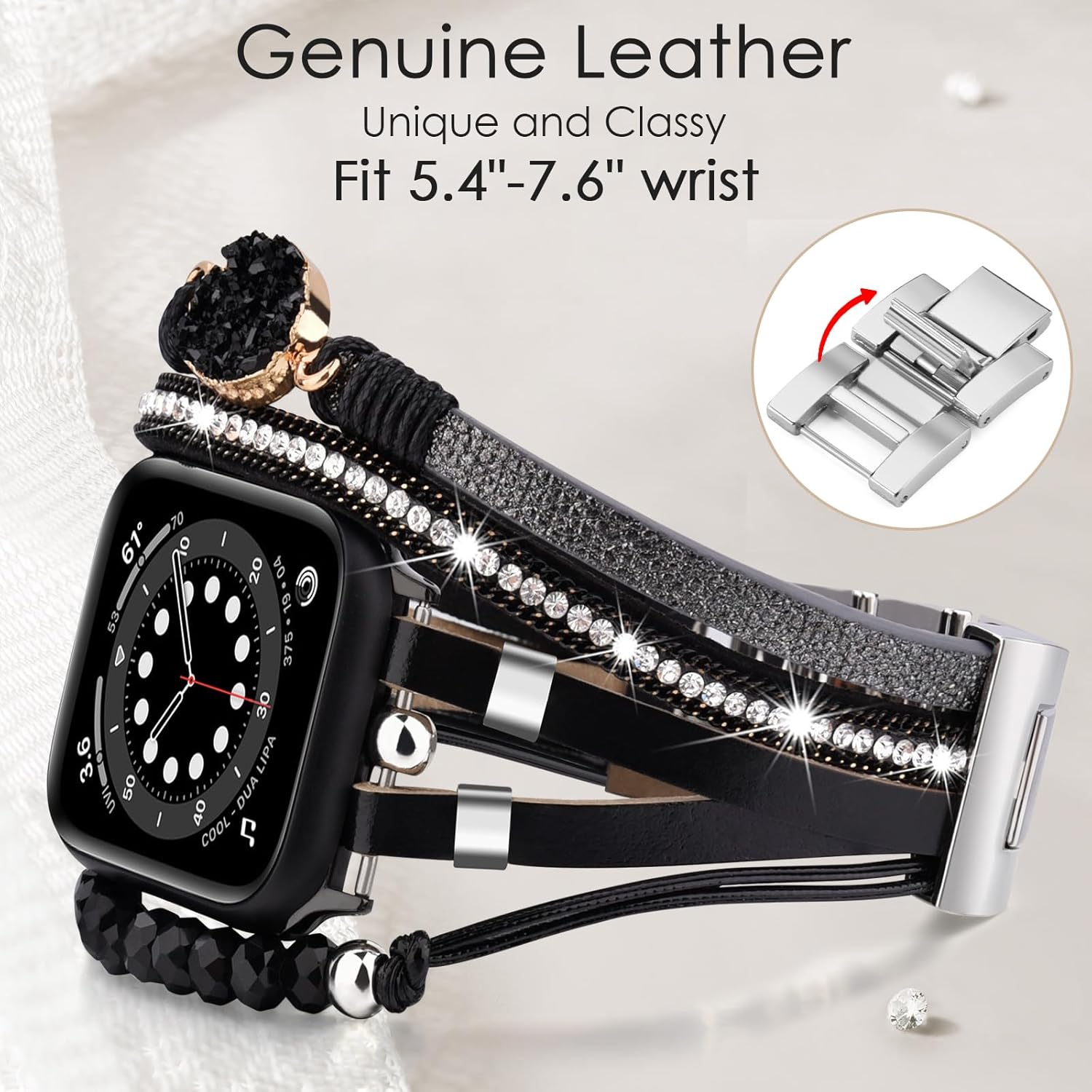 ✿Unique Patent Wrap Watch Bracelet Compatible with Apple Watch 38mm/40mm/41mm42mm(series 10): Made of high-quality natural stone, leather, and natural crystals, the multilayer iphone watch band is perfect for matching with jewelry or clothing which makes your Apple Watch more delicate than normal watch and enough for work and stylish enough for a party, dance, or date