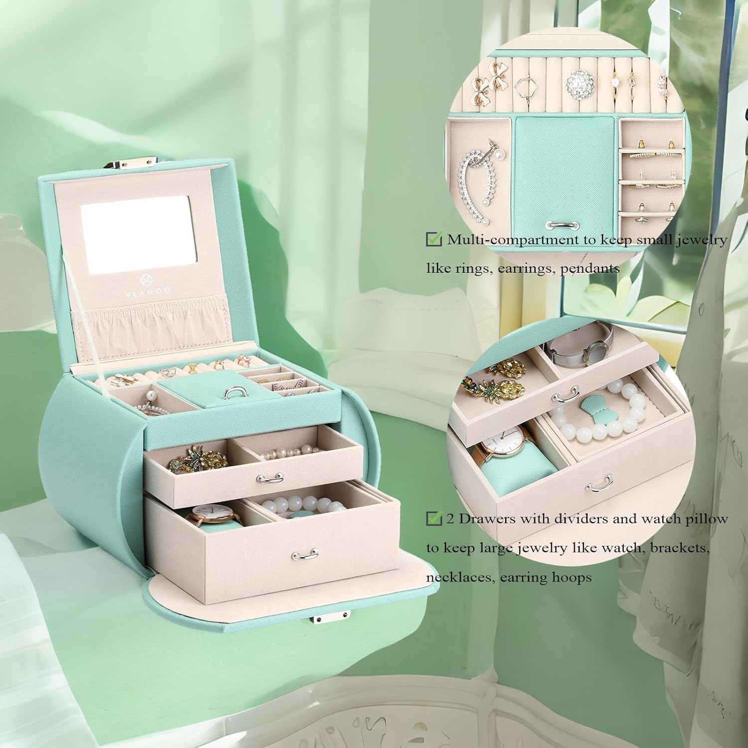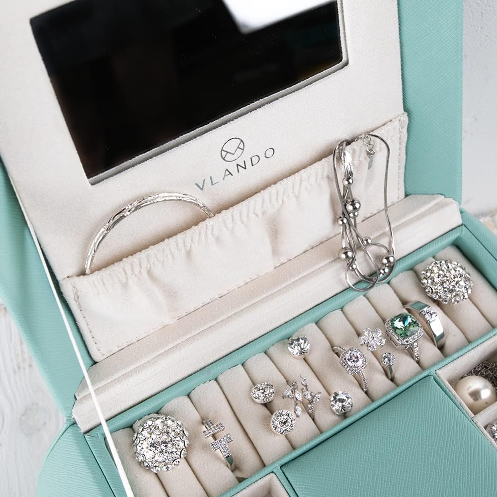 Vlando Jewelry Box Organizer, Leather Mirrored Jewelry Case in Princess Style, Necklaces Earrings Rings Watch Storage Holder, Mint Green