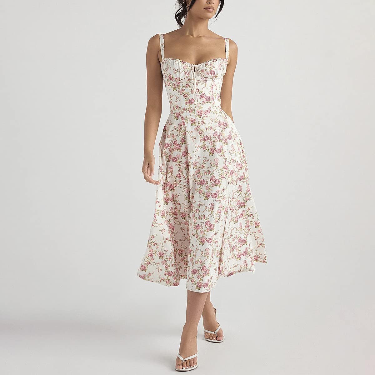 Corset Midi Dress for Women, Summer Floral Spaghetti Straps Flowy Sundress/Slit